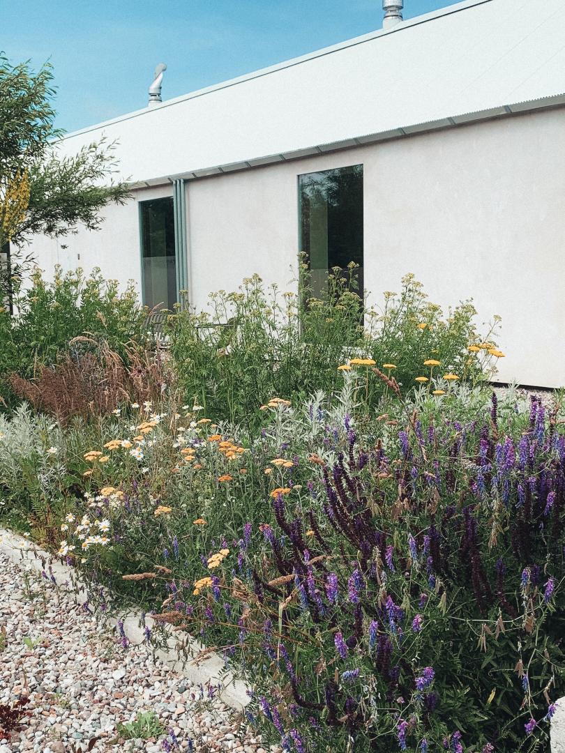 The colourful and lively flowerbed in the front of the house is made by selecting and cultivating local herbs and flowers from the surrounding meadows.