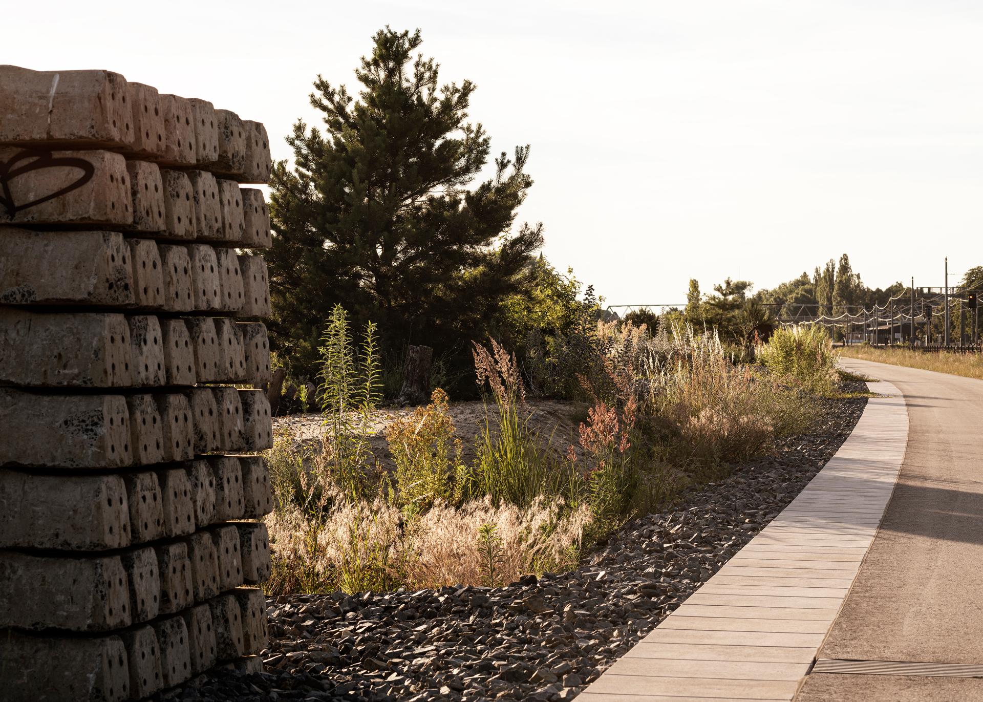 A gray band of slabs runs along the new, asphalted pedestrian and biking path to emphasize the axiality. On both sides are dry grassland sites worthy of special protection and valuable habitat areas for the sand lizard, which uses the ballast of the former track areas as a home territory. We have not only preserved the remains of the former use, but also integrated them into the design: Stacked concrete sleepers serve as rhythmizing, structuring landmarks as well as a new habitat for native fauna. We have attached the hectometer signs to these sleeper blocks at intervals of one hundred meters as a reference to past railroad history.