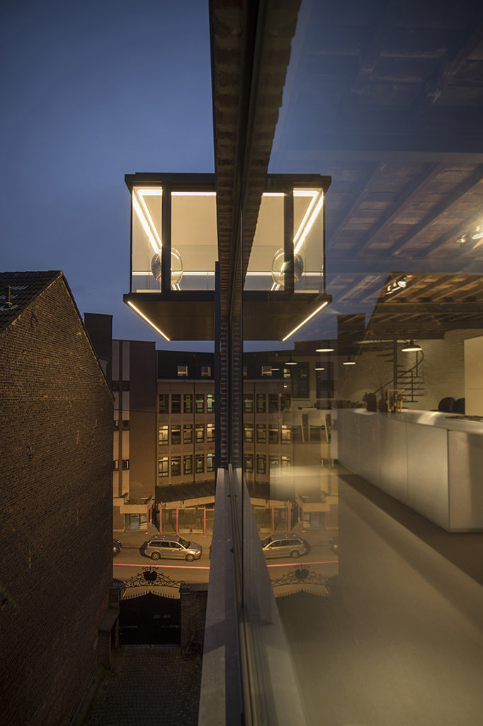 Respecting the existing building but convinced of the need for a strong architectural gesture, the extension is placed on the roof: a cantilevered glass box above the courtyard that serves the various units.