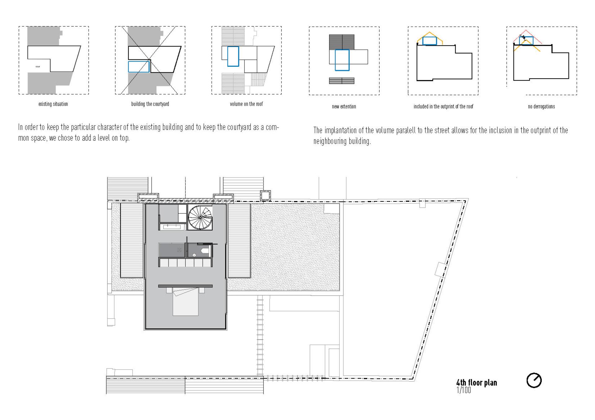 By changing the orientation of the top level perpendicular (and not parallel) to the neighbouring building we respect all the requirements of the authorities, without having any derogation. The volume of the new level enters completely in the outline of the adjacent edifice. The square becomes a rectangle, thus offering more square meters and consequently more space to the inhabitants. As architects, we are always in search for smart solutions to offer quality and adaptability of the space.