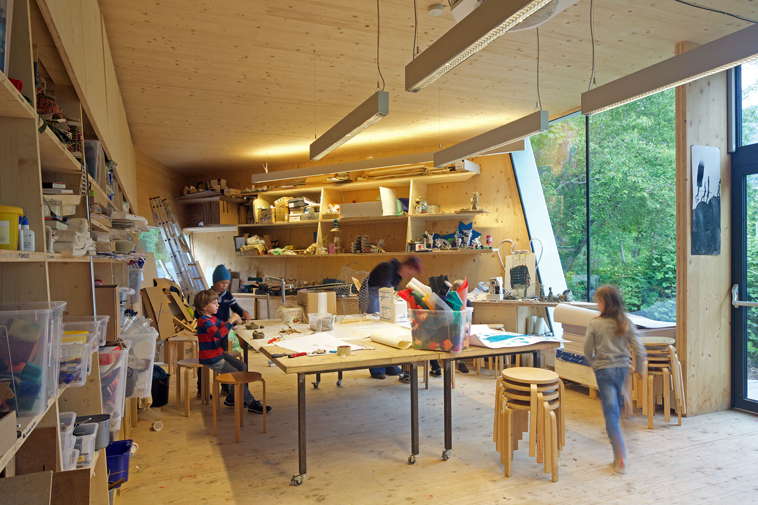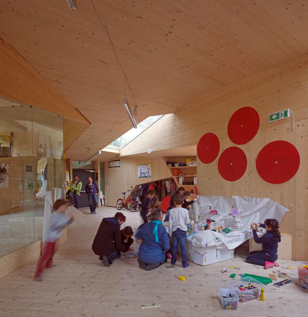 bilding Kunst- und Architekturwerkstatt für Kinder und Jugendliche in Innsbruck is an institution for art and architecture for children and young adults, which is unique in Austria as well as internationally. bilding is an experimental, open space where young people are encouraged to explore their creativity, to discuss and discover architecture, painting, sculpture, design, and new media. bilding is a space for creative freedom which clearly shows in its architecture. The spatial concept and materiality create a flow in the space which opens perspectives in- as well as outwards making tangible the desire to experiment. bilding shows that creative work is all about being curious, developing questions, recognizing problems, creating constructive solutions, and allowing for multiple approaches. Thinking outside the box, communicating in a creative way, leaving one's mark, actively participating in a creative process oneself, all these things open and connect, strengthen the personality and prove to the children that they can participate in shaping their environment. Participation is free of charge and thus allows all children, regardless of social or cultural background, to participate. Approx. 225 children between the ages of 4 and 19 attend the workshops every week. In addition, bilding offers workshops and school projects all over Tyrol, creates teaching materials and organizes advanced training programmes. Based on the conceptual preparatory work of a voluntary collective of architects, architecture students from the University of Innsbruck carried out the further design work. On a site, made available by the city of Innsbruck, a privately financed pavilion-like workshop building was constructed, which also enriches the public park with its unique architecture. Designed and constructed by young people for young people, bilding is an experimental space, a place for change, which sees education as “a work in progress” and encourages everyone to actively participate.