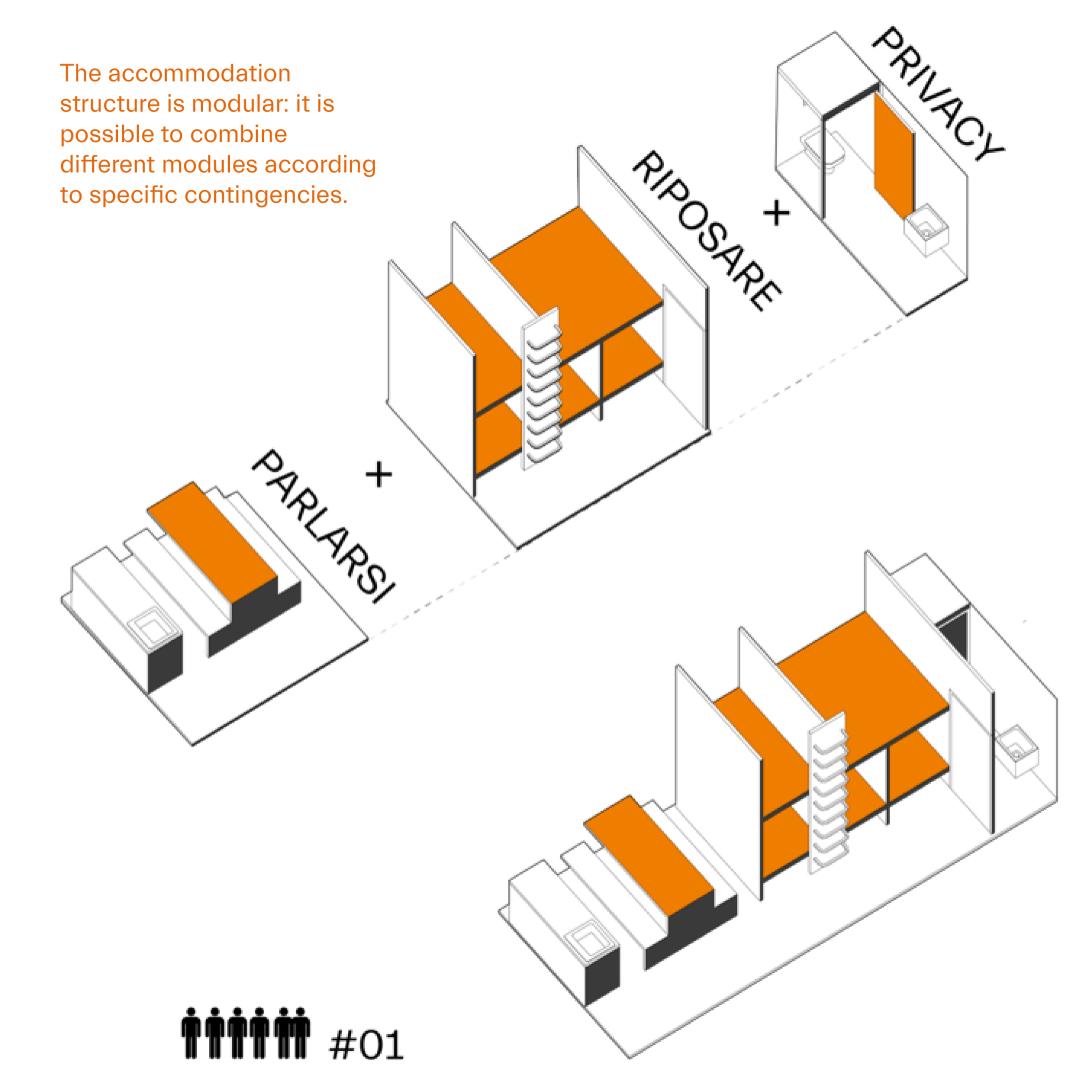 Our idea is to structure accommodation facilities in crucial points of slow paths, integrated with the surrounding environment and perfectly adhered to the principles of social inclusion. The structure itself, in fact, is made of wood and it is built inside institutions for the rehabilitation of prisoners, useful to their reintegration into society. Even the wood is part of the vision since it comes from areas affected by an extreme storm called “Vaia” that in 2018 has felled 16 million trees in four different Italian northern regions. The use of this timber can be a form of support to affected local economies and communities.