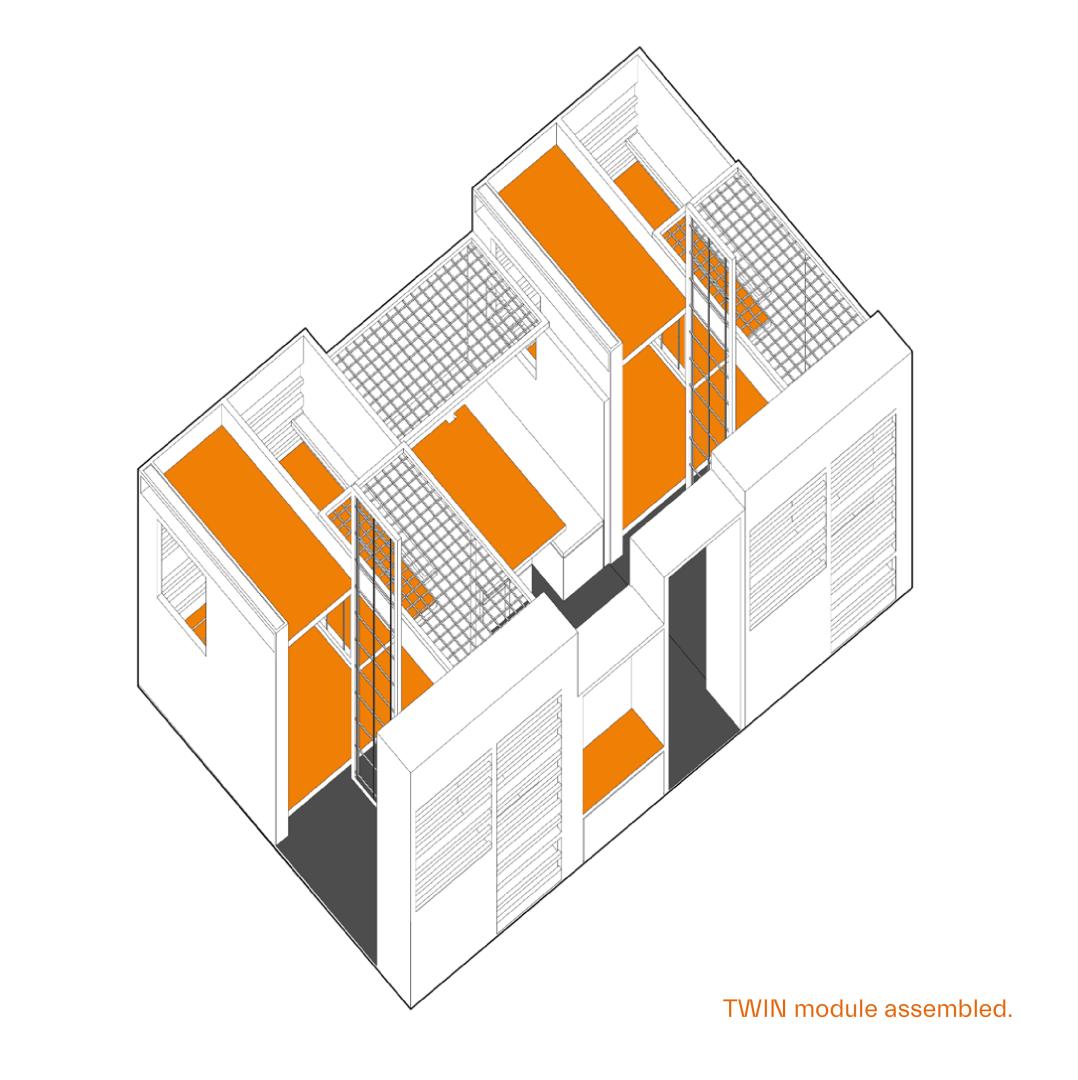Starting from slow tourism, we want to offer a new aesthetic experience able to tell the territory through a new look. For this reason we have activated a small receptive activity for the summer season 2021 that will serve as an overnight place along the tourist routes. The TWIN module can be located inside an existing building, or outside as an independent structure with its own cover. In any case, the location will become a narrative space, able to tell the beauty of the place and the strategicity of a new inclusive model of slow tourism. The storytelling project takes place through a plurality of languages that exploit art and design the horizontal and vertical surfaces available, and the elements that the context offers. In detail, the modul is a light micro-intervention measured on the gestures of people and the playful dimension of living spaces. Its dimensions recover some characteristics of the small high mountain bivouacs, able to summarize in a minimal space the intimate dimension of living and the community dimension of being together. It is based on the use of low-tech construction techniques and high replicability from any simple enterprises. In this way it is possible to involve local craftsmen and carpenters in its realization, possibly also providing for the employment of fragile people in the workshops: a process that adds unique cultural, technical and aesthetic value to the materials. The design of the TWIN module, finally, introduces within its spaces some devices for play and relaxation: elastic nets to use as hammocks or rope nets instead of stairs, developing the playful dimension that these spaces can express. The result is a use of spaces minimal but not apathetic.