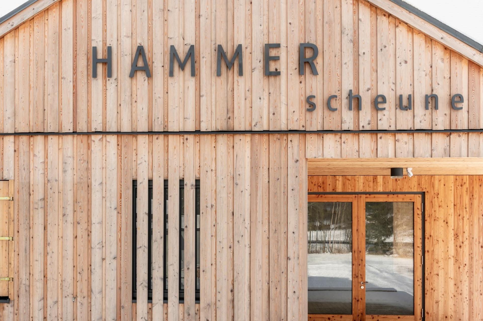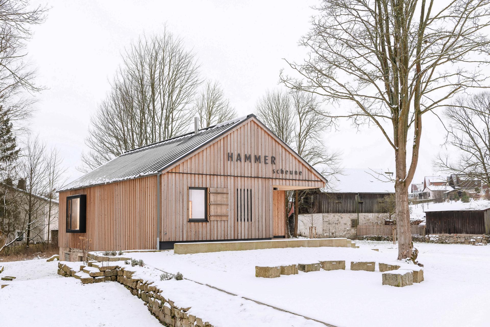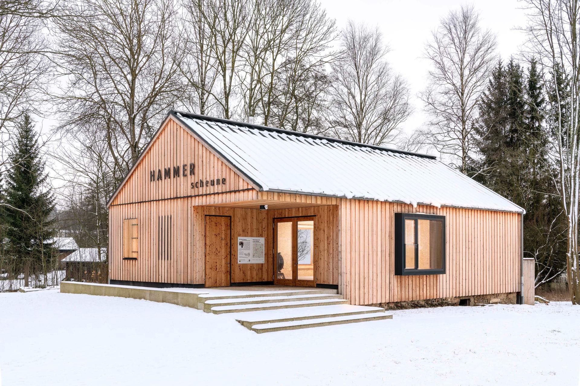 The site along Hammerweg is built testimony to the economic past of the Fichtelgebirge (Fichtel Mountains). The year 1398 marks the first documentary mention of Niederlamitz. In 1499, two blacksmith’s workshops are identified: an upper and a lower hammer mill. Hammer masters operate the lower hammer mill with its hammer forge. Beginning in 1770, the iron foundry also plays a significant role in Niederlamitz. Dwellings and outbuildings are erected at the forge. The functional and structural changes that have taken place up to the present led to the demise of the built structures. The revitalization and new use of the hammer mill site, or “Hammerareal” as it is known locally, is an important step toward understanding the built environment and its history. Due to the poor structural condition of the building ensemble, preservation was no longer possible. The city acquired the site in 2016 and demolished the buildings that same year. The cellar vault of the former tavern survived and was protected beneath a concrete slab. This serves as the foundation for the new Hammerscheune (Hammer barn), the meeting place for local citizens. The building, which measures 16 meters long and 10 meters wide, was erected in wood-framed construction. Two distinctive window openings and a notch at the entrance complement the building’s simple shape. In the north part of the building, there are service spaces such as the kitchenette and the sanitary facilities, which are accessible from both inside and outside. The barn’s immediate surroundings are ideally suited for spending time outdoors and as a place for communal activities. A themed trail about the history of the Niederlamitz hammer mill is designed with explanatory information boards. The creation of a small ditch symbolizes the former watercourse that enabled the use of water power to run the hammer mill. The revitalization is an outstanding example of civic engagement and the establishment of modern infrastructure in rural areas.