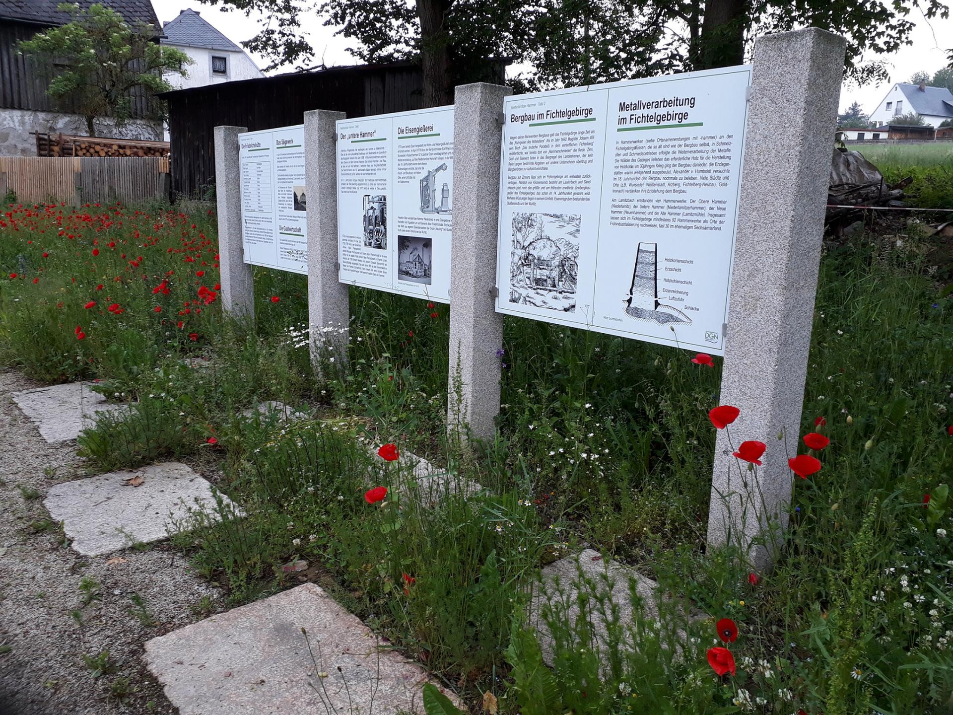 Niederlamitz belongs to the town of Kirchenlamitz, which actively promotes sustainable and future-oriented development. For more than 12 years, the town of Kirchenlamitz has teamed up with other market towns, cities, and communities to work together, especially on urban design problems, at an intercommunal level and across district boundaries. Topics concerning demographic change and concepts for urban development and climate protection are discussed and initiated in this forum. Aiming to help shape the development of the village, the citizens of Niederlamitz have brought to bear a great deal of commitment. What has emerged is a meeting place for young and old. Its location on a transregional bike trail allows everyone with an interest to take part. Coming from the train station, even wheelchair users have barrier-free access to the new community meeting place, the Hammerscheune, in allusion to the former hammer barn. The door to a barrier-free WC is incorporated into the notch in the building, enabling free access day and night. The roof overhang also serves as a shelter for cyclists and hikers. A place to celebrate and remember has been created. Info panels on the open-air grounds tell the history of the site. To commemorate the reunification of Germany, three trees were planted. They are a symbol for growing together and connecting people with different histories.