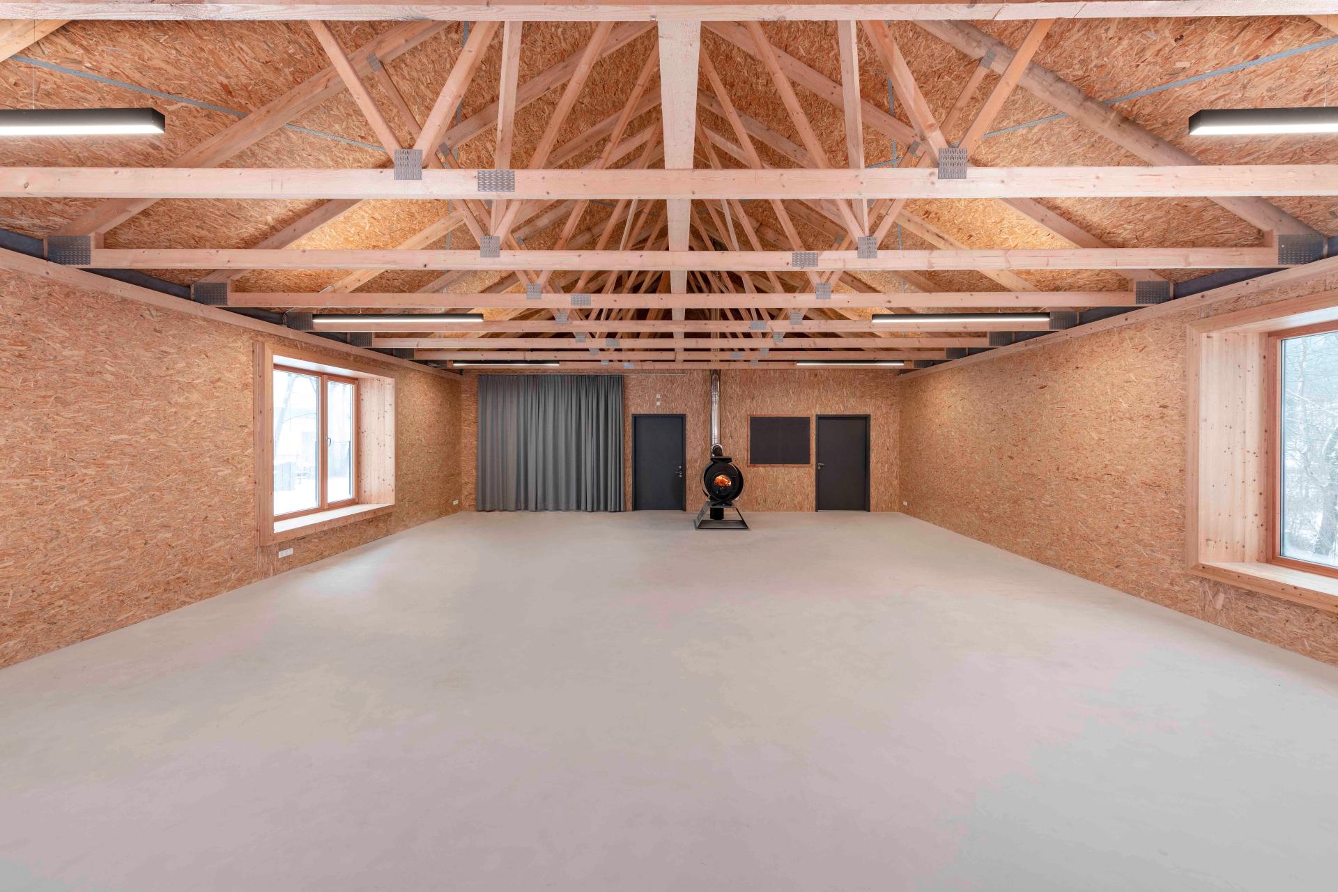 The hammer site was developed by successfully dovetailing building construction and landscape architecture. Here the architectural practice of Peter Kuchenreuther, together with landscape architect Marion Schlichtiger, has designed a harmonious visual ensemble. Experience in handling the material, the professional skill of the planners, and the contributions of local artisans are reflected in a special way in the design. The central meeting place is conceived as a Festscheune, or barn for holding special events, that occupies the dimensions of the former tavern: 16 × 10 meters. It is a wood framed structure clad with vertical wood boards. The simple and traditional barn shape was chosen deliberately, but the deep notch at the entrance area and, above all, two distinctive window openings situate the amply sized building in the present. The interior reveals a large event space with a visible roof structure. Spartan furnishings allow the interior space to shine to its best advantage. The spatial functions are limited to the essentials. A stove provides warmth in winter, floor-length curtains are reminiscent of a theater, and two beautiful, large windows with deep wooden sills beckon you to sit and linger. Your gaze wanders out on one side to the new terrace on the site, on the other side to the floodplain.