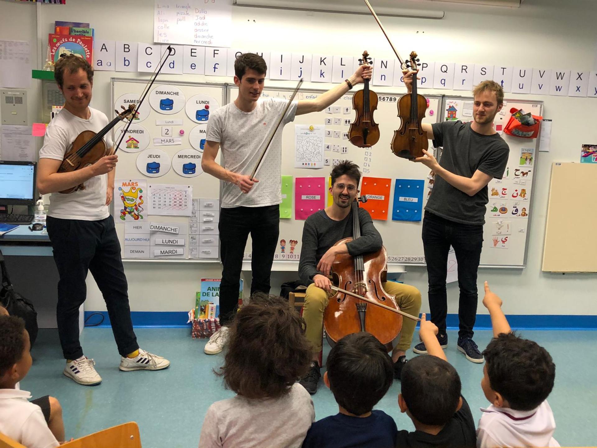 FourFun brings chamber music in schools, in small rooms, parks, school gyms or school theaters. It gives new working opportunities to young musicians while making young students get in touch with live classical music. It creates bridges between young professional musicians and schools who are usually not able to create such a network unless some teacher personally knows a musician.