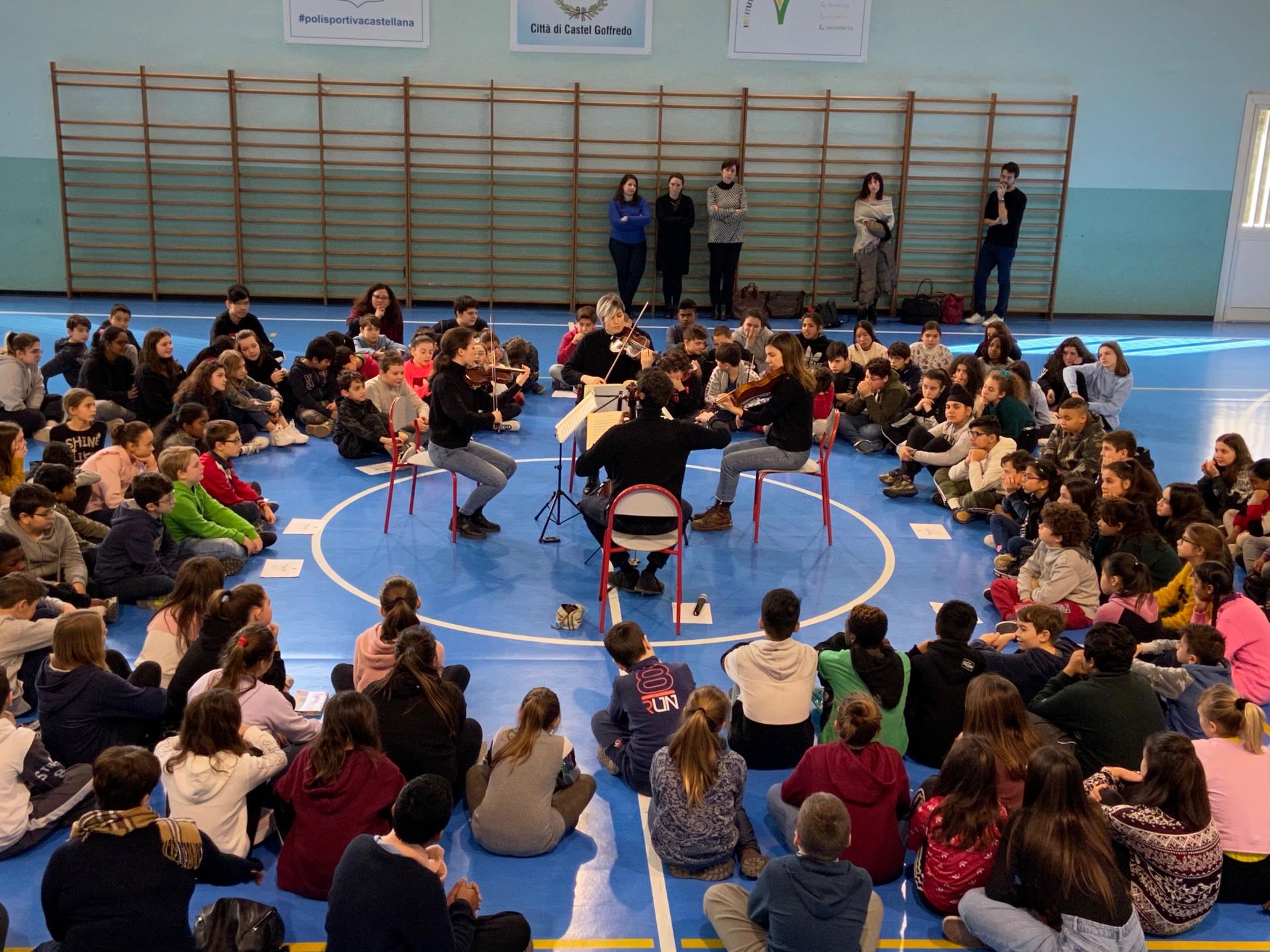 This project teaches civic education, literature, history, music and the European values through the work of the String Quartet. The four modules of FourFun can be perfectly adapted to the curricular plan of each class, integrating teachings of different school subjects in every lesson. The repertoire of the string quartet can be easily related to historical facts and periods (for example, in the past events of FourFun in Italy, musics by Shostakovich have been played to talk about dictatorship). When we implemented FourFun in schools, we were all surprised by the impact of the musical language and its ability to teach many different values and subjects to students. The level of interest and concentration has always been really high. A professor of Scuola Media Bettinzoli in Brescia said “For all the students it was a wonderful experience and – I would add – also for my fellow teachers, who were impressed by the fantastic young instrumentalists and the listening and observation skills of our students”.