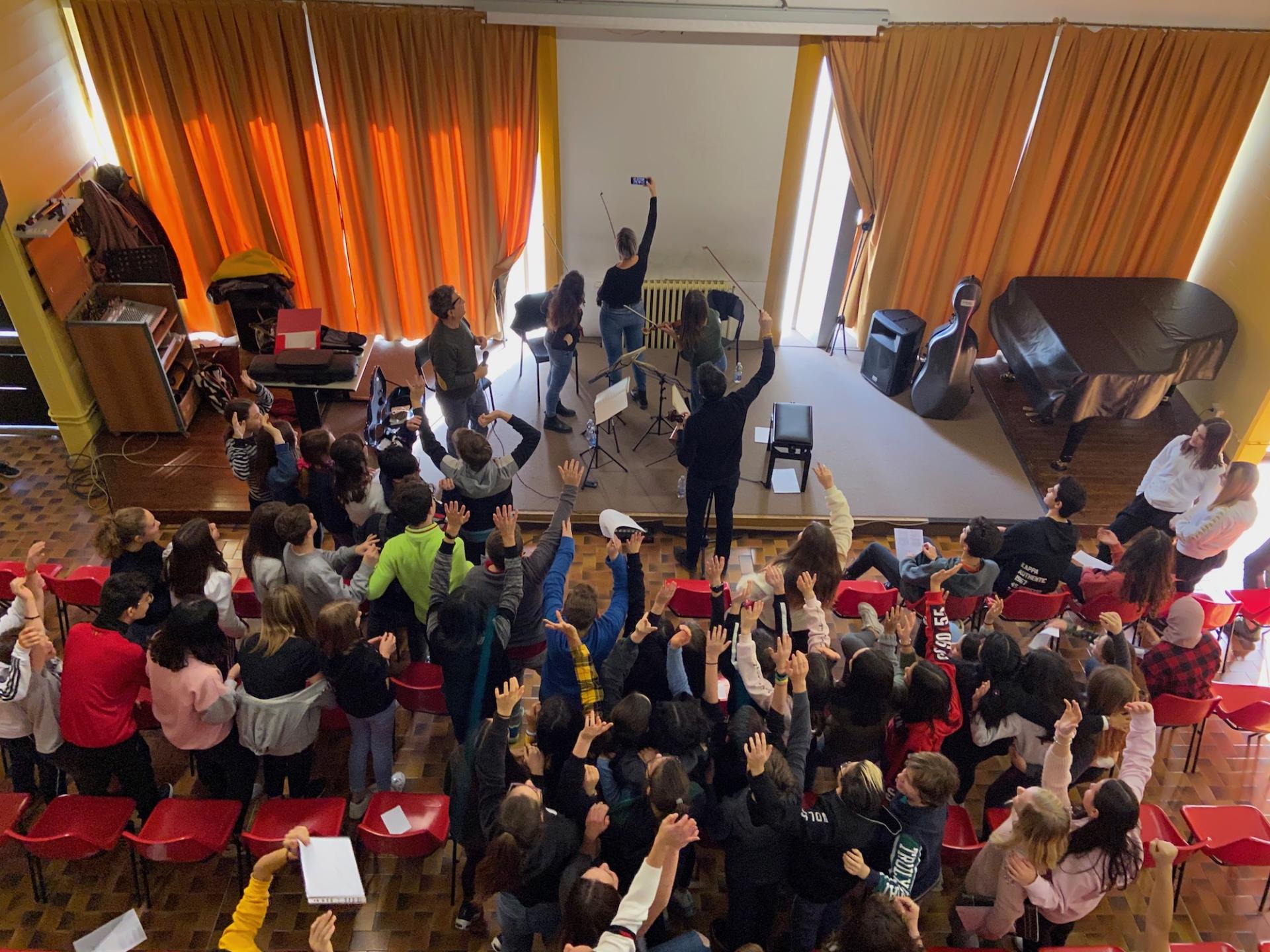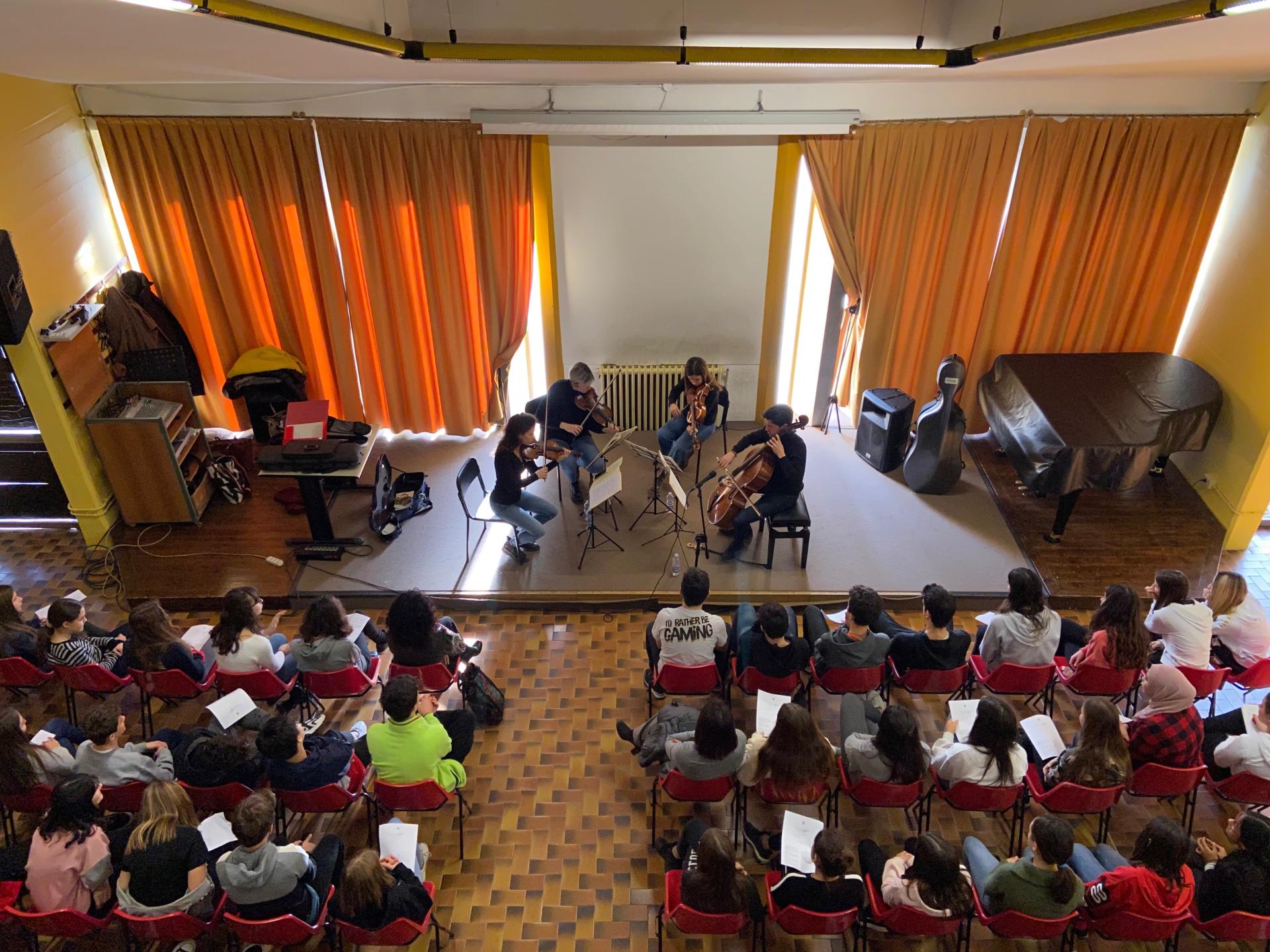 An important feature of Fourfun is the physical proximity of the students: they sit around the ensemble and are able to grasp the dynamics that give life to music: movements, breaths and looks of the musicians.