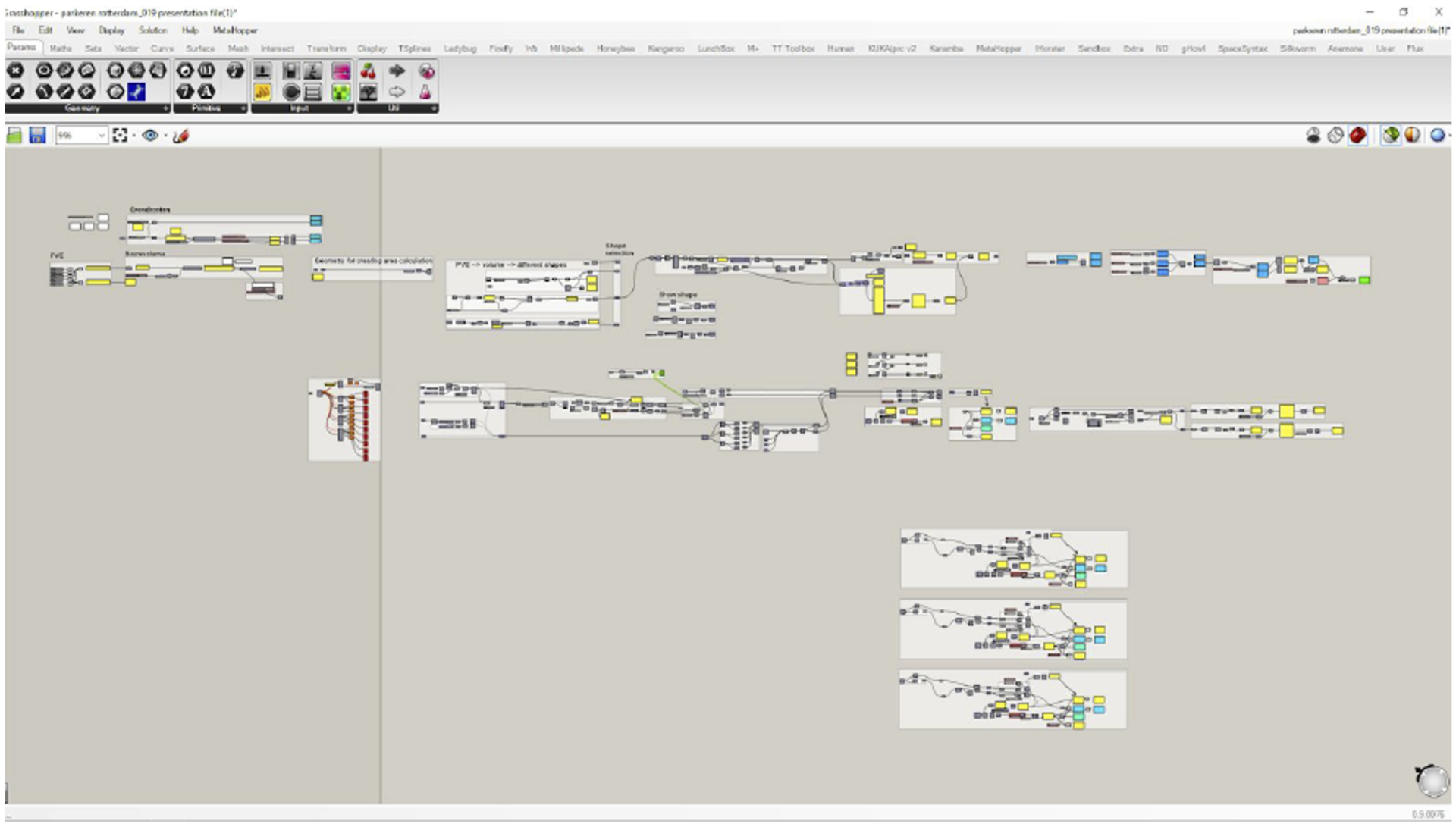 After this, the script is augmented to support that many data can be abstracted from this model. Tweaking the parameters, any change in the model is immediately recalculated to have immediate feedback from choices being made. The stakeholders can test their own choices* and have feedback immediately, in its full transparency to see for the other stakeholders.