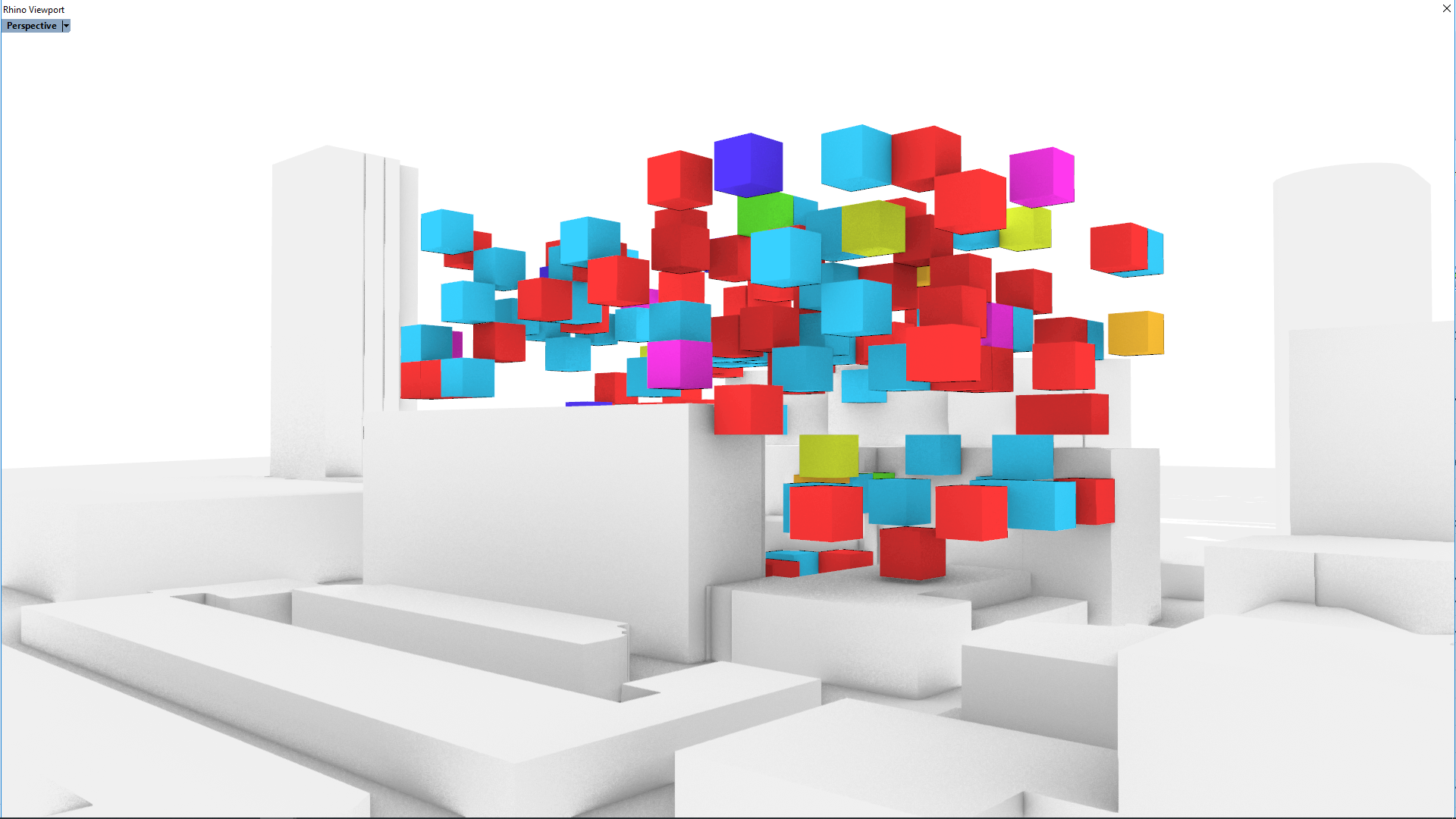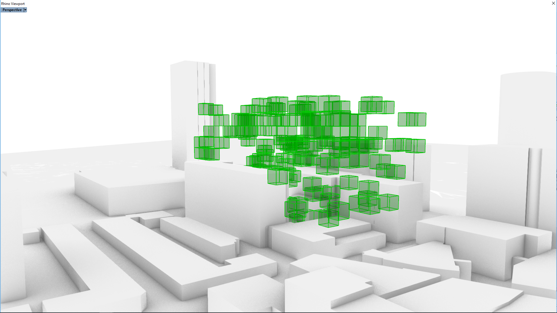 The programming of the design game for multimodality is executed in Rhino/Grasshopper. The general strategy is to set global and local parameters driving the constituting modules. The sequence of specification starts with selecting active reference points from the point cloud’s 3d array of reference points. Then these points are represented by a cube. Next step is to apply the level of porosity to the selection, whereas a randomiser selects the percentage of visible cubes. Furthermore, we have introduced attractors to attract certain functions. The strength of these attractors determines the number of affected cubes, positioned within the zone of influence of the attractor.