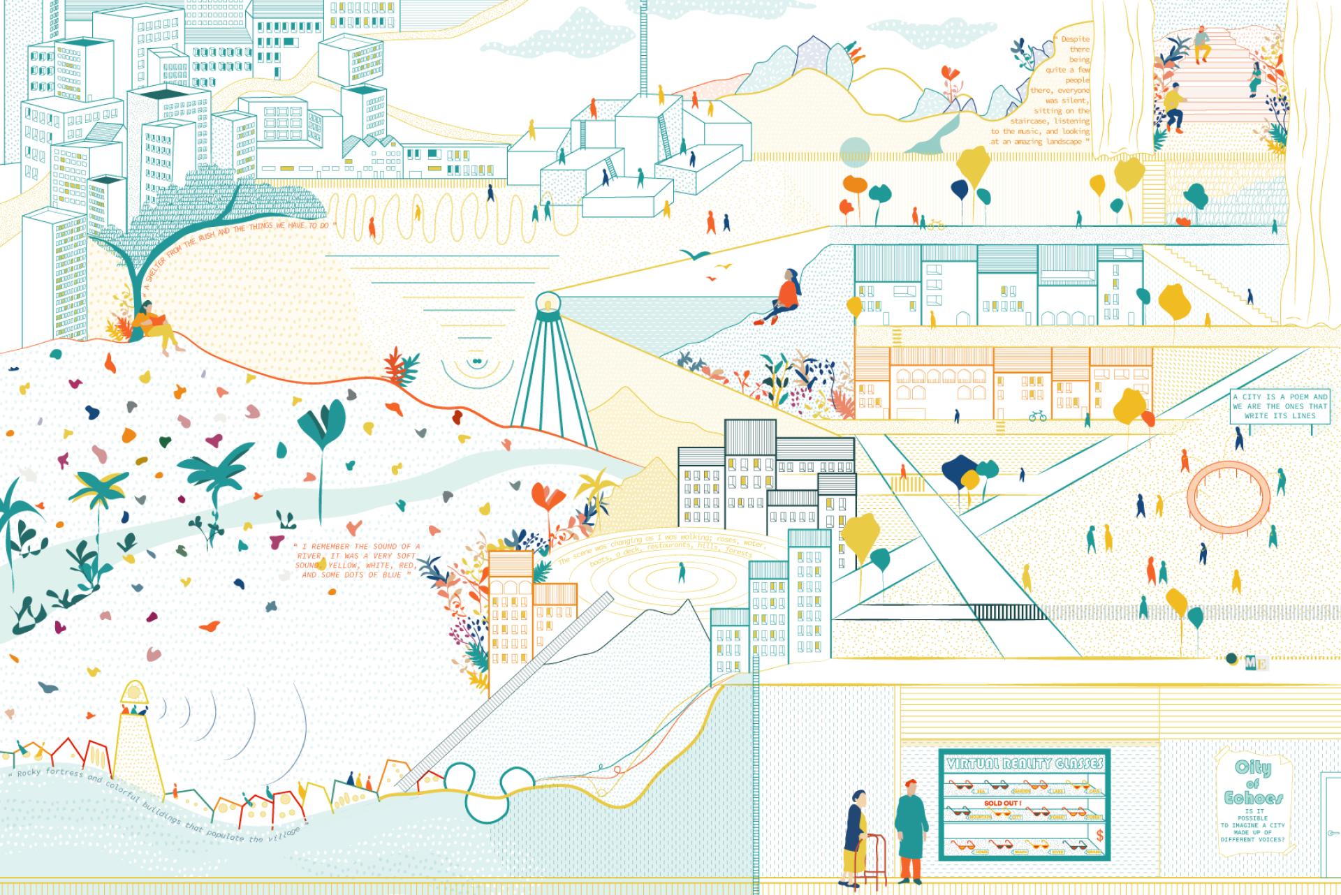 City of Echoes is a living lab for architecture and urban design. Here we adopt a horizontal approach and imagine inclusive, beautiful and sustainable cities together with people. In order to do that, we started with the definitions of these three values and asked ourselves two questions: