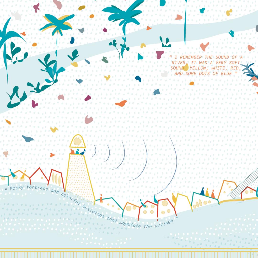 As the first exercise we asked people to describe us a beautiful place they have been to without mentioning its name and location. We did not know at the time, if we would receive inspiring voice messages or if this would lead us anywhere. We also did not know what we will exactly do with them. And that is why we call it a living lab. We experiment and find out. We played the voice messages during our virtual meetings as the team and while listening to them, each of us started imagining the place they were talking about. Once done, we started discussing it and showed each other our visualizations. That is when “City of Echoes” was born.