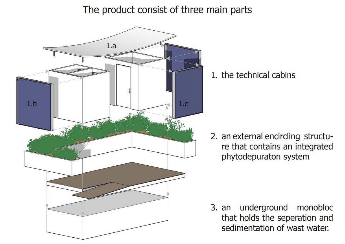 PhiTOilet presents an external encircling structure for wetland phytodepuration system and an underground monobloc that holds the separation and sedimentation of waste water. The grey and black waters are separated inside the monobloc to reduce the end-volume to be purified. The maintenance of these models regards management of the vegetation and periodic emptying of the solids sedimentation compartment.