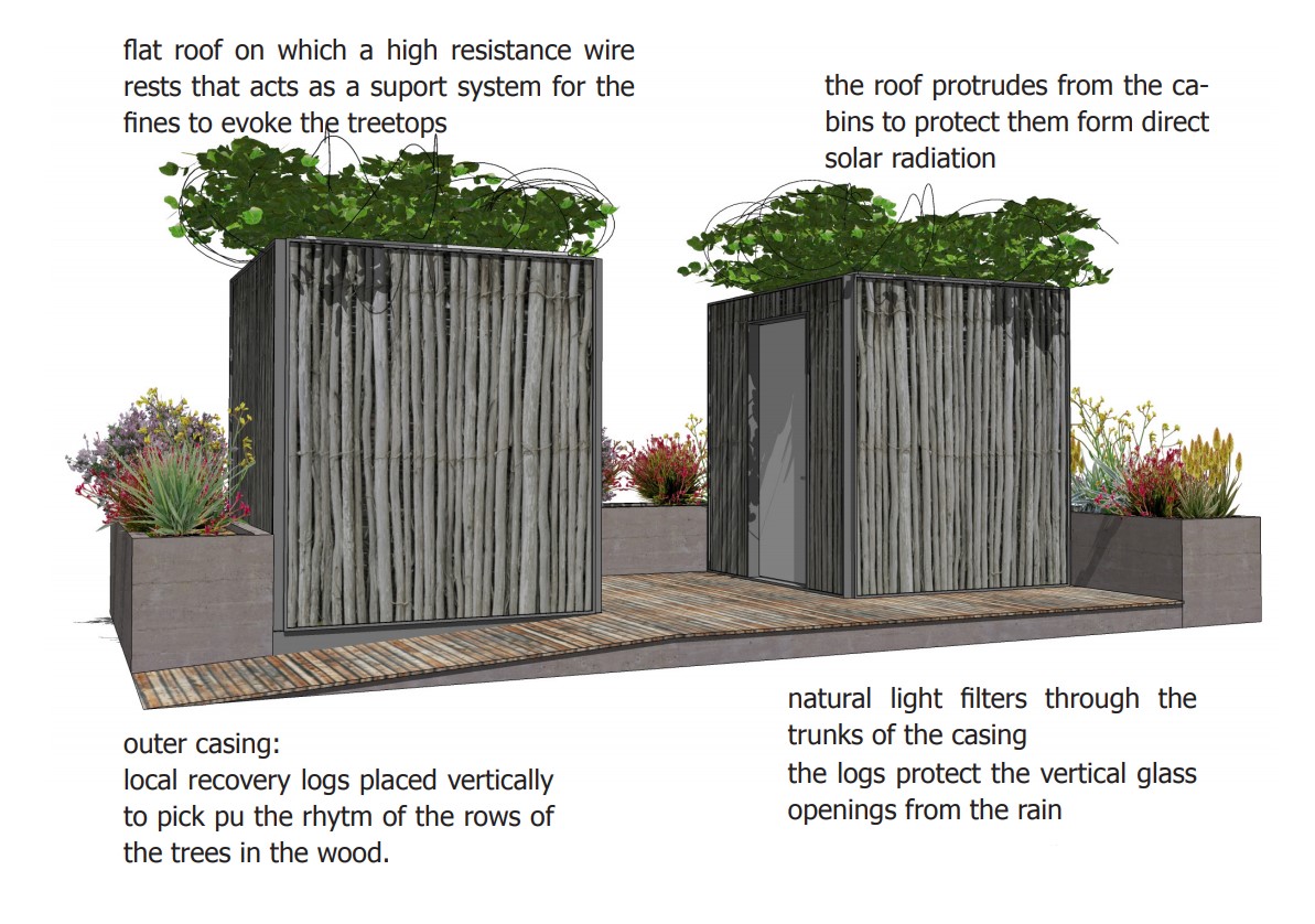 The external casing is always changing cause is designed to be made of environmentally friendly materials available on the site of the intervention that provide a wide range of aesthetic choices: depending on the landscape and climate context these may be stones placed in a metal cage, recycled bottles filled with sand, trunks of salvaged trees, ect.. applied on a wall support.