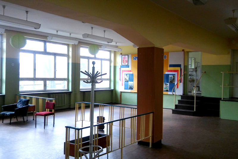 The building of Przystań Śmidowicza 49 consists of four storeys, about 3100m2 of space and almost 5500m2 of allotment. Two workshop labs were set up: sewing one and art one. Art workshop was equipped with stove for ceramics, sewing with proper equipment as well. At request of citizens furniture artisanal workshop was set up in the basement. Sport classes are organized in the big gym, exercise room and two fitness rooms. Each of these places comes with dressing rooms, magazines for sports equipment, toilets and showers. Outside area - green courtyard and chestnuts trees surrounding also received special care. In order not to destroy their roots instead of classic concrete pave walk special one was created from composite. In addition nesting box and hedgehog houses were built. The green patio court with safe surface was built along with: basket goals, mini climbing wall, playground with sandbox, slide and swing. Outdoor gym with various cross fit devices was constructed. Part of the patio is taken by a lawn where for example picnics can be organized. In community garden citizens can grow vegetables, spices and flowers together. Everything is complemented by an outdoor cinema screen. In addition, Gdynia Municipal Information Point made it much easier for residents to settle some matters, without the need to visit City Hall.