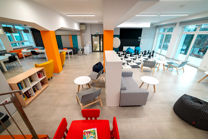 In order for the school building to fulfill its new functionality in the best possible way, it was necessary to develop its concept - and, consequently, to rebuild it. On the one hand, it was necessary to take into account the expectations of the residents participated in consultations, and on the other - the specificity of the work of the institutions and support organizations that were to operate at Przystań Śmidowicza 49. At the design stage, it was assumed that all stakeholders and users of the centre would use most of the spaces jointly. Thanks to this, they can serve more people, and the facility is used to the maximum functionality.