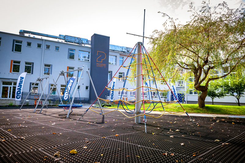 When creating a space, special care was taken to preserve the nature around the building. The green courtyard and the chestnut trees growing from the front are carefully surrounded by special composite transition instead of the traditional pavement to preserve the roots. In addition nesting box and hedgehog houses were built.