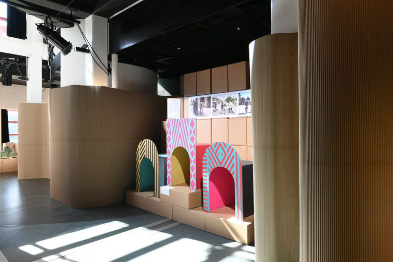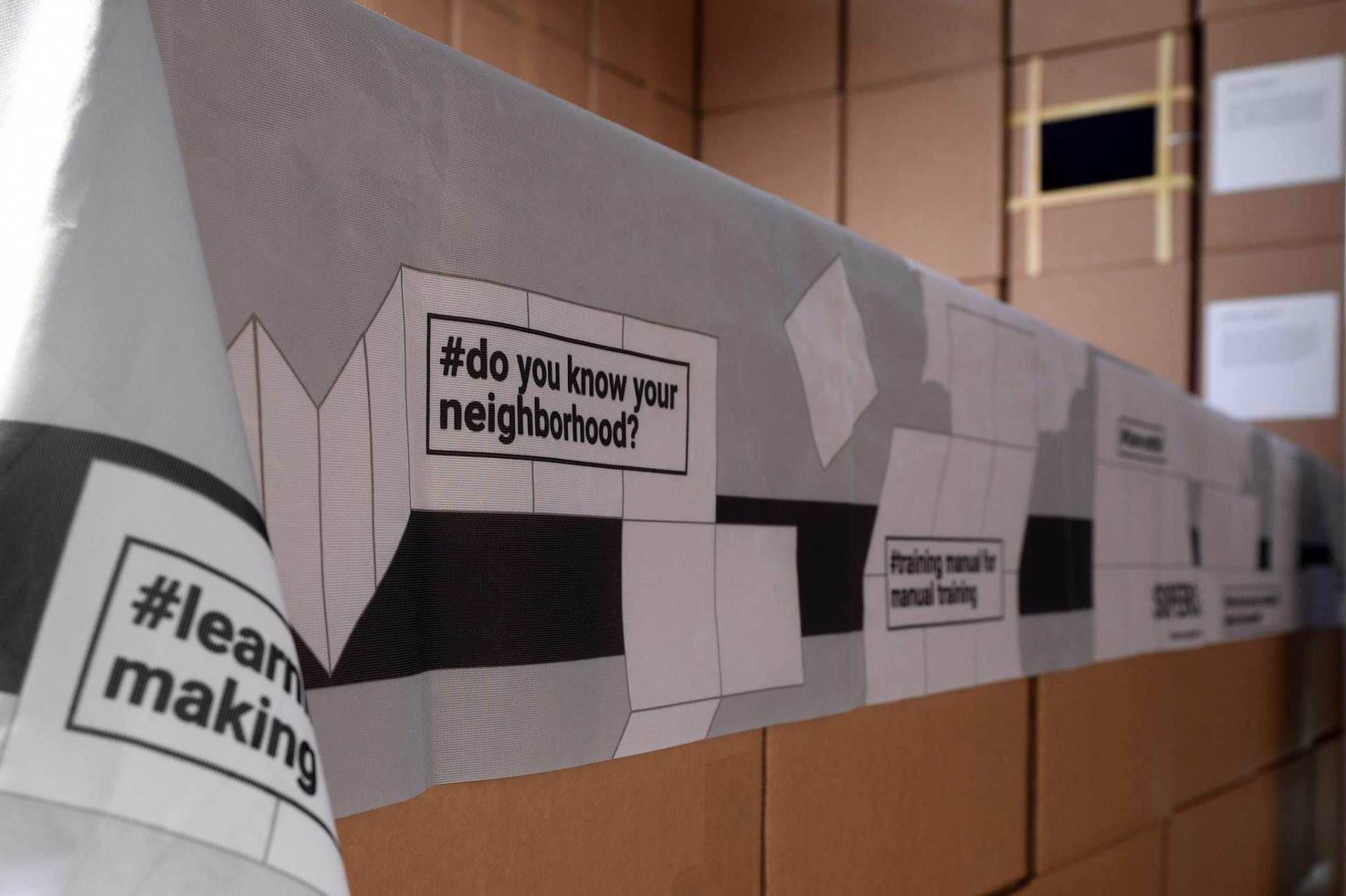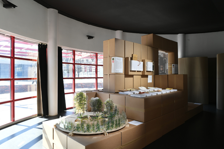 The Expo-Action proposed to gather and share a set of projects all in progress whose selection was developed by paying particular attention to the sustainability of its context of action and location. The scenography was composed by a light, dismountable cardboard sculpture with a low economic and environmental impact. It was thought as being part of an ecosystem of available materials, by adopting an aesthetic of displacement and temporary occupation, by proposing a light and modular construction. Cardboard boxes and non-woven paper gave the ExpoAction its aesthetic and structural qualities. Its structures made up a modular and infinitely de-foldable system-work, following the shapes of the building and de-forming itself to favor a clear readability of the different contents of the exhibition. The cardboard scenographic element was a work in itself and participated closely in the purpose of the exhibition project. We chose the cardboard producer for its ecological engagement and at the end of the exhibition the totality of the exhibition was recycled by another specialized company that came on the site with cargo bikes.