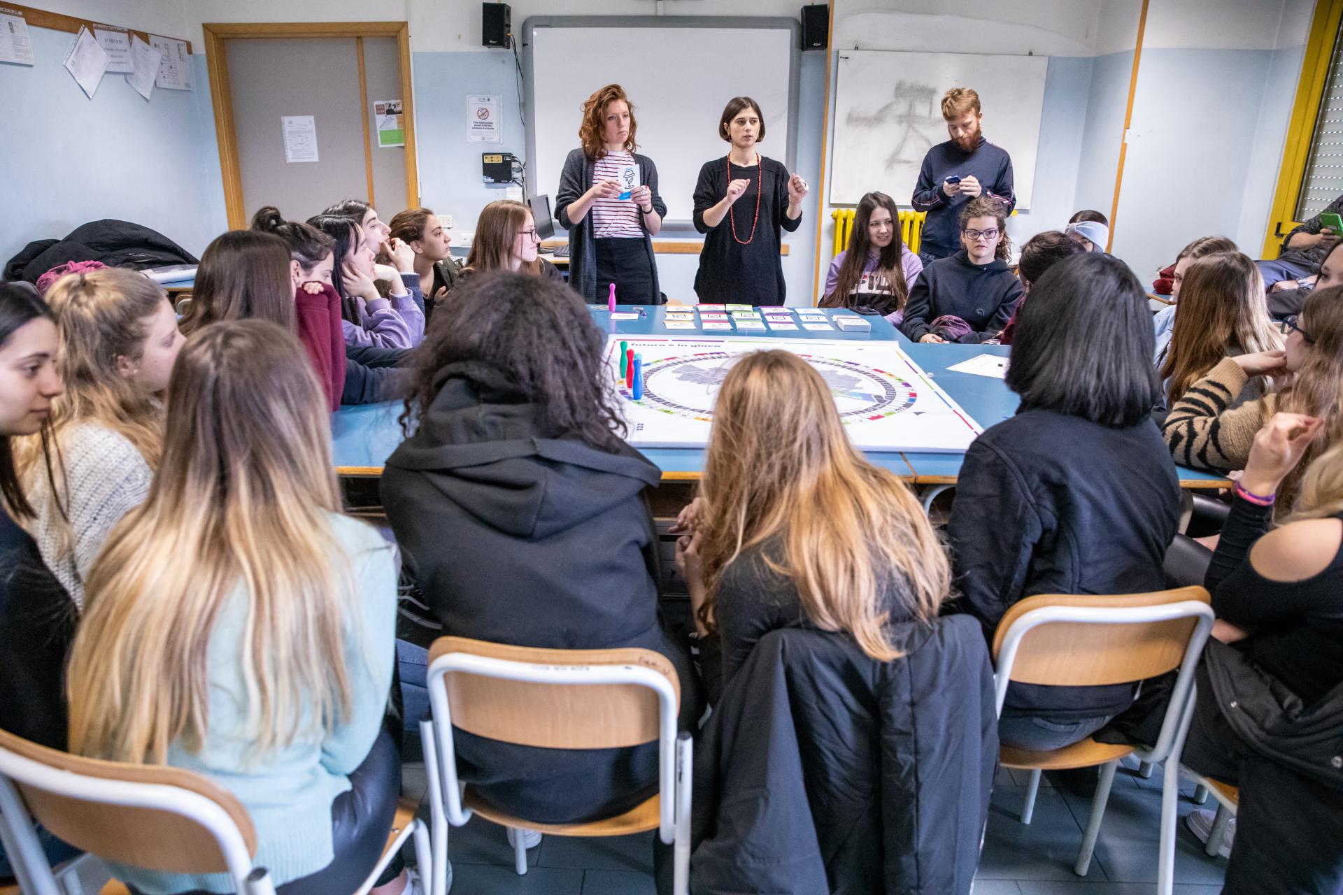 Politico Poetico's aim was to integrate secondary schools curricula with new and engaging tools for understanding sustainability challenges, as well as with expressive means by which to take and promote action. The cooperation between Teatro dell’Argine and Fondazione Innovazione Urbana has made it possible to provide students with a totally new educational pathway. On one hand, the Foundation’s know-how in civic imagination tools and participatory practices has made it possible to rethink the thematic analysis of complex matters, re-processing information, and data into board games, and role-play for students to internalize sustainability goals by having fun. On the other hand, the artistic direction and long-term experience of Teatro dell’Argine in using theatrical tools and practices to enhance dialogue and inclusion and foster individual participation and collective action among people of all ages and backgrounds facilitated the students' creativity and communication skills.