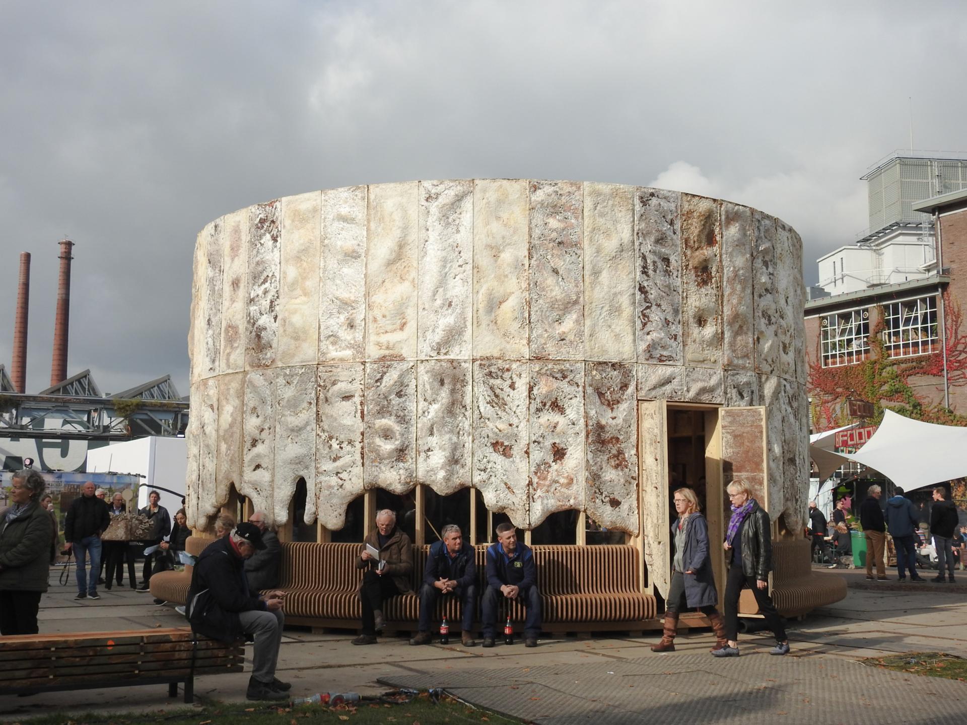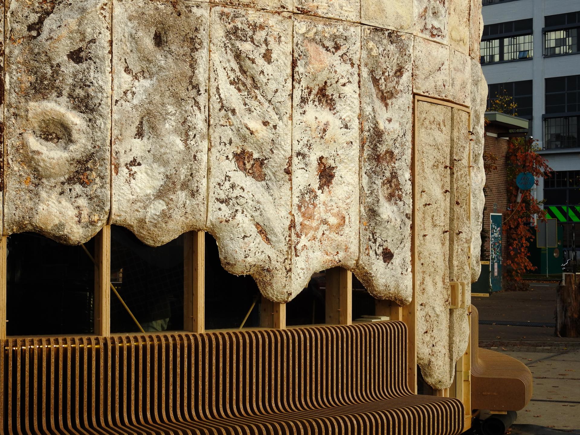 We want the origin of material and technology, in this case mycelium, to be leading in the design. The flexibility with which you can grow mycelium in molds and model yourself has been enlarged in the design. The characteristic relief and the wavy window openings provide a unique dynamic force that makes it seem as if the pavilion is still in full growth. We have let fungus growth and color spectrum run wild. Creating a new aesthetic causes a new appreciation for biobased materials, both for designers/ producers/ architects and for the future consumer.