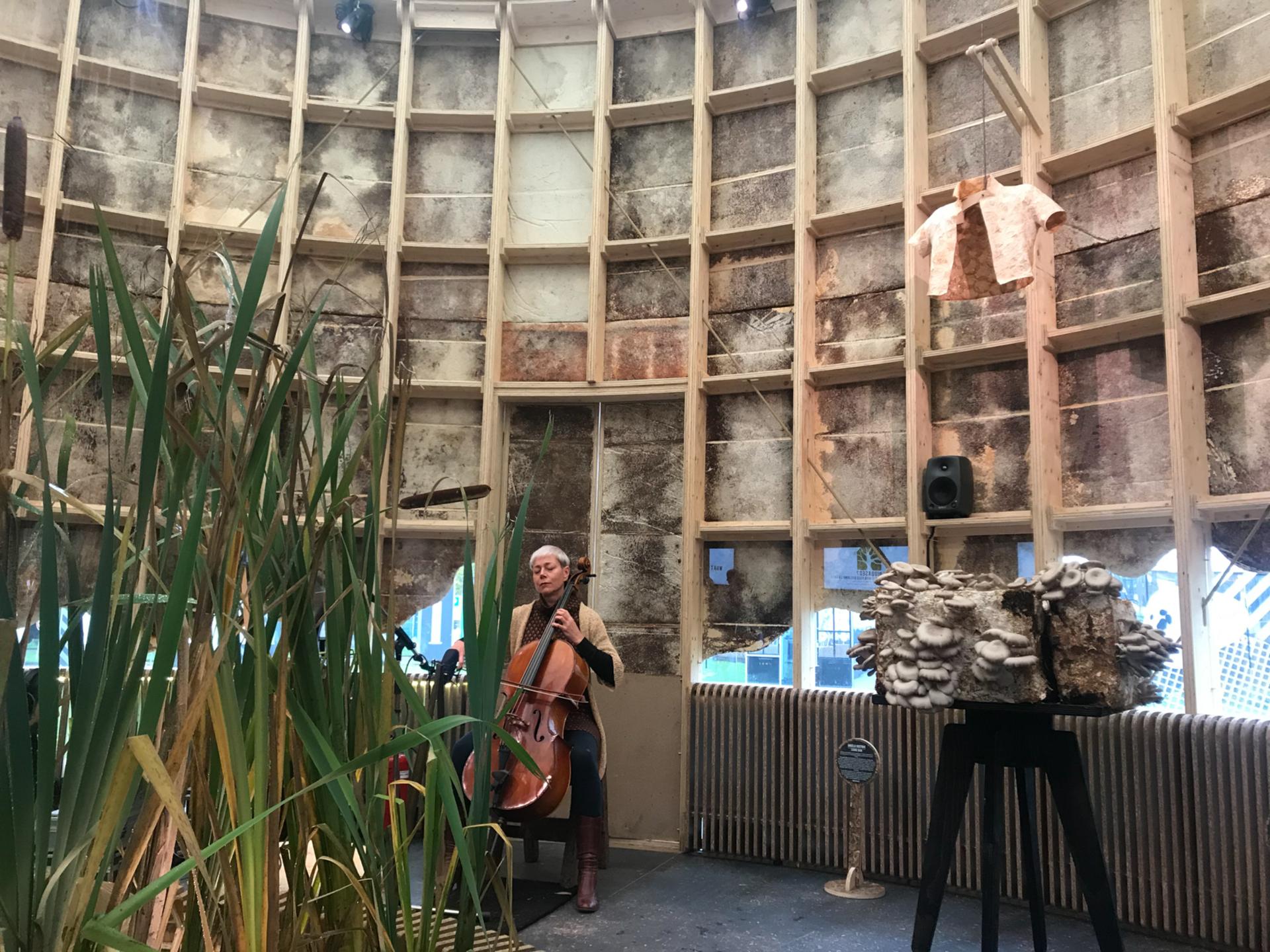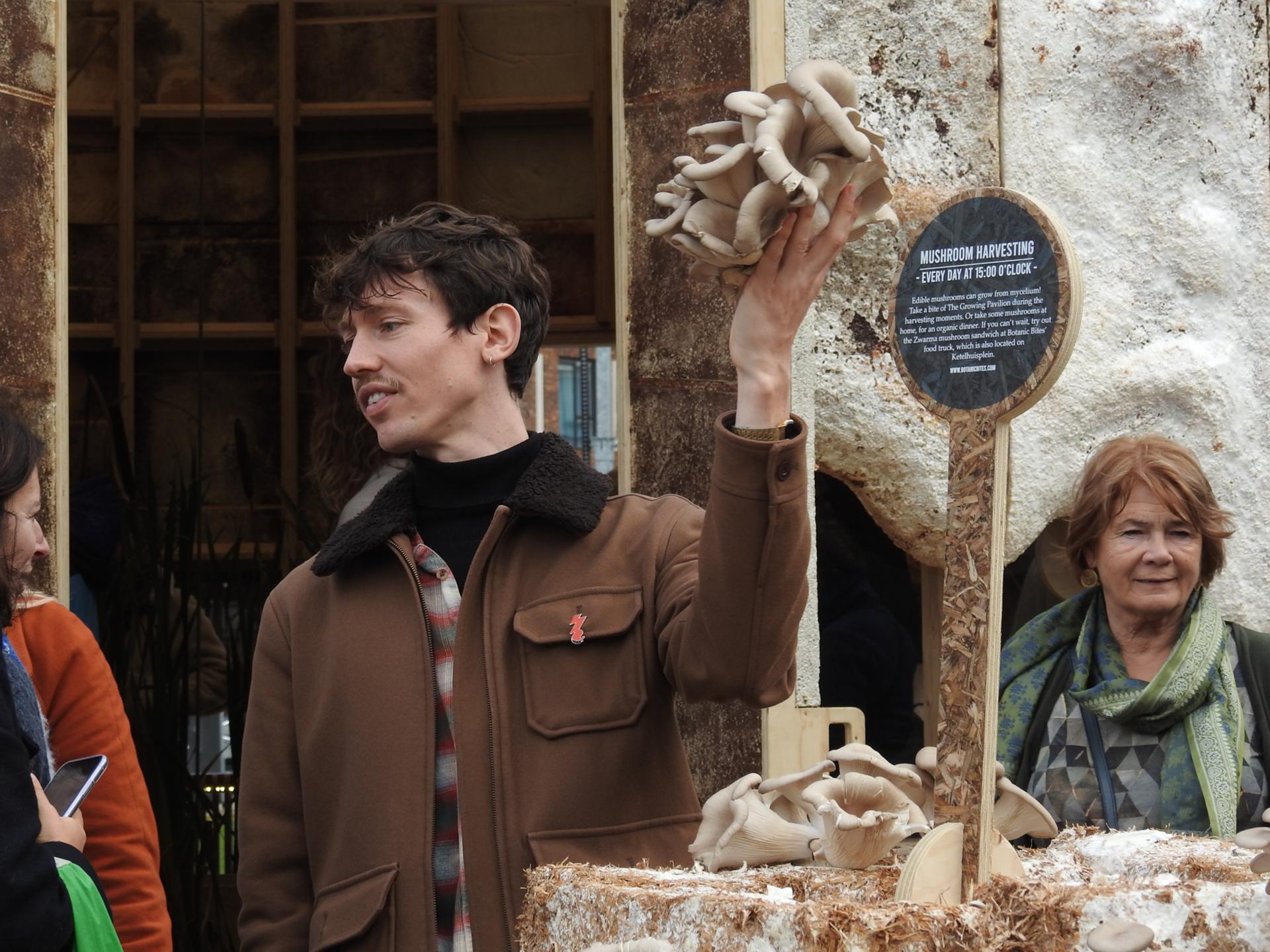 The pavilion's aesthetics appeal to a lot of people. The material makes people curious and draws people in. In combination with the program and through storytelling, we reached a wide audience. In ten days Dutch Design Week more than 75,000 people – industry professionals, governmental figures, organizations but also many “consumers” and design enthusiasts visited the pavilion. The storytellers of Company New Heroes were there every day to bring the pavilion further to life. People could inform themselves via information boards, videos and a materials atlas and / or hear more in one of the tours. Jacqueline Hamelink created Growing Music especially for Dutch Design Week. Every morning there was a live concert in the pavilion with music by J.S. Bach. Nature sounds and improvisations were added to this and a soundscape was built that was played during the day in the pavilion. We organized daily harvesting of edible oyster mushrooms that grew from mycelium, so visitors could harvest and taste fungi. In addition to showing the beauty in the construction, visitors could view other biobased creations made by different designers in the pavilion. They show how beautifully grown furniture, lamps and other objects are.