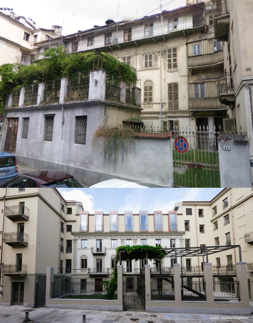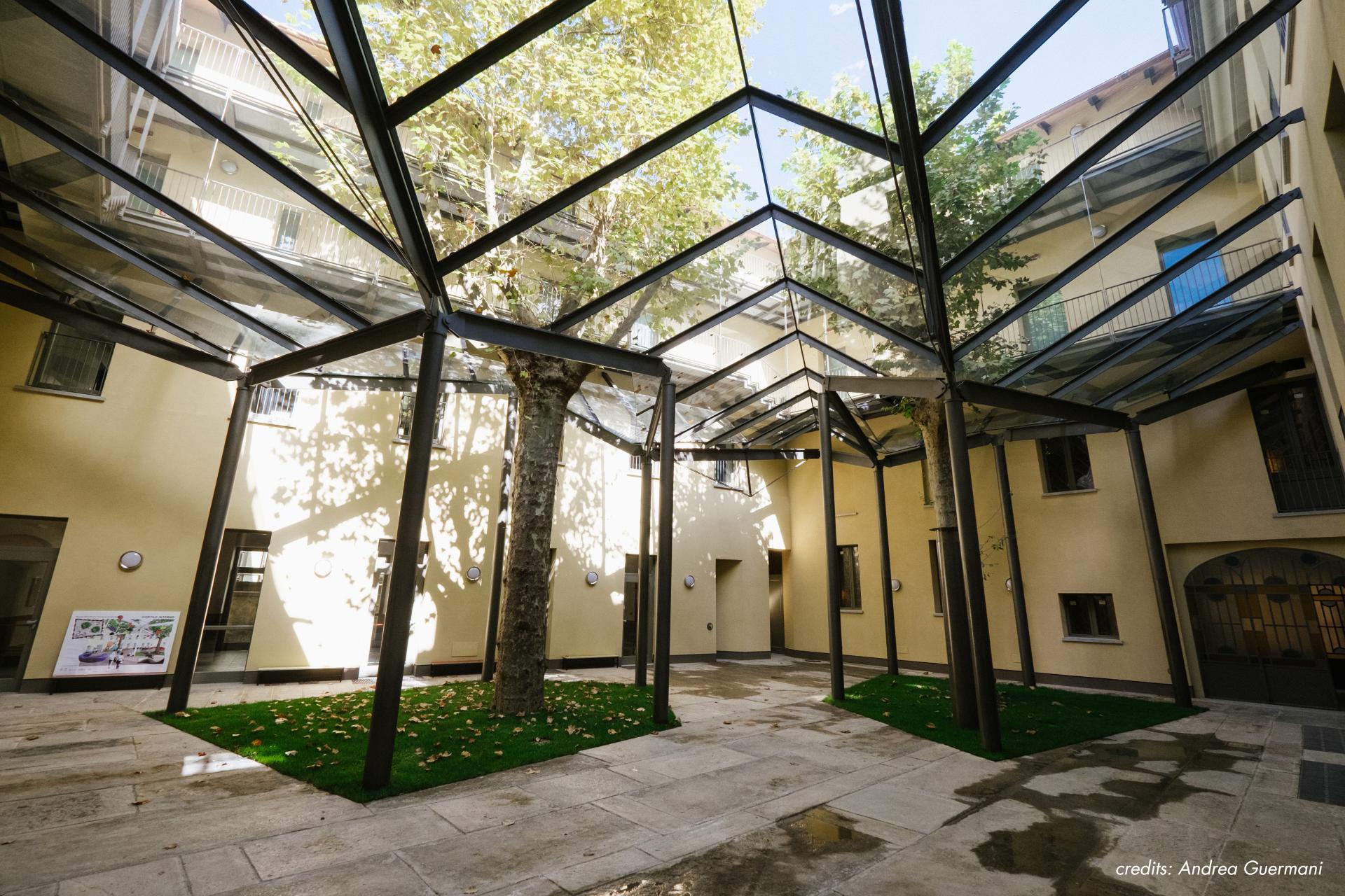 For the TDSS we can mention instead the new full-height bow-windows that give great liveability and brightness to the apartments (configuring as a recognizable and contemporary architectural sign), the new courtyard on the facade that re-proposes the original wrought iron gate interspersed with glass covered passages (contemporary taste) and the historic wisteria (preserved with a new light support structure), but also even the glass roof of the inner courtyard used to cover the kindergarten outer space.