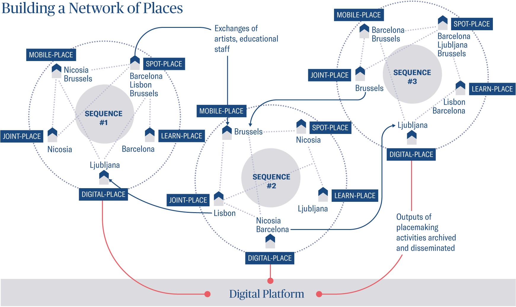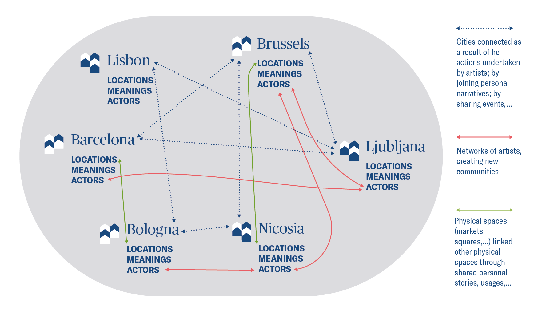 In our multicultural societies, the notion of place is not limited to a given space and time, but crosses spatial and temporal boundaries. The purpose of “A-Place” is to design and implement art-centred placemaking activities in six European cities –Barcelona, Bologna, Brussels, Lisbon, Ljubljana, and Nicosia– to foster community cultural development by connecting meanings and experiences associated to places. Through site-specific art, creative spatial practises and cultural projects, “A-Place” engaged a variety of stakeholders -residents, artists, architects, students, policy-makers- in a process of reflection through actions about the meaning of and value of creating places.