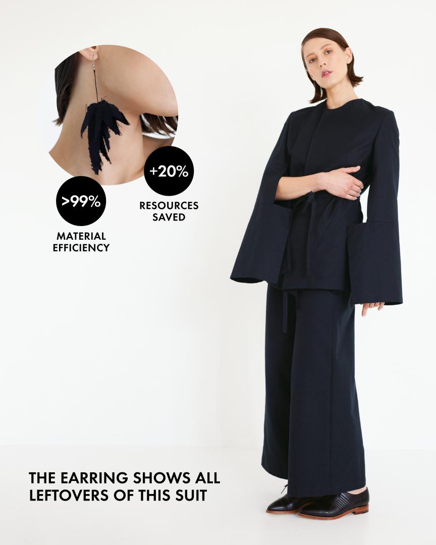 To convey in an aesthetically pleasing manner how little waste is generated for example in our pantsuit, we developed an earring from its fabric scraps, which has since become our trademark. So even the last little thread is appreciated as a valuable resource and has a purpose.