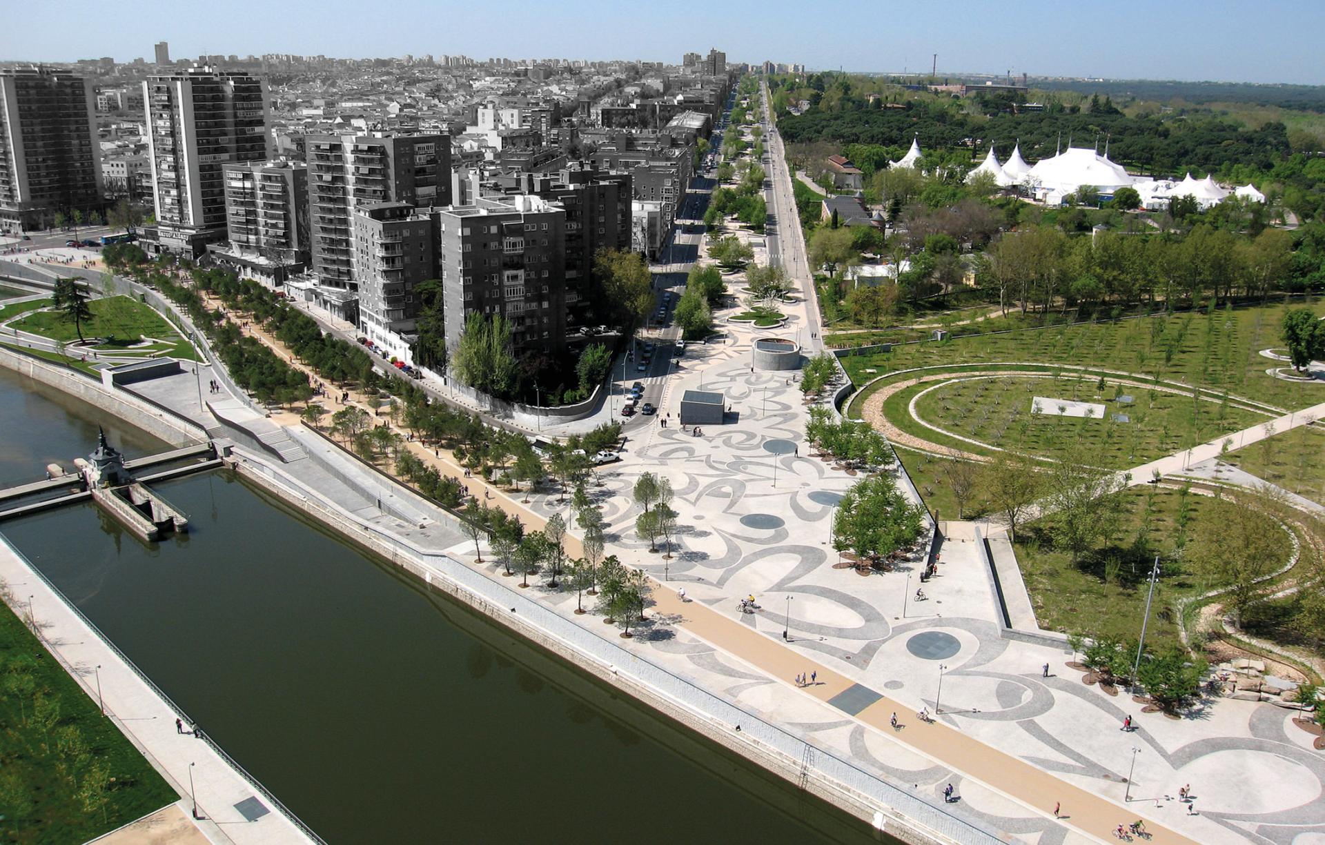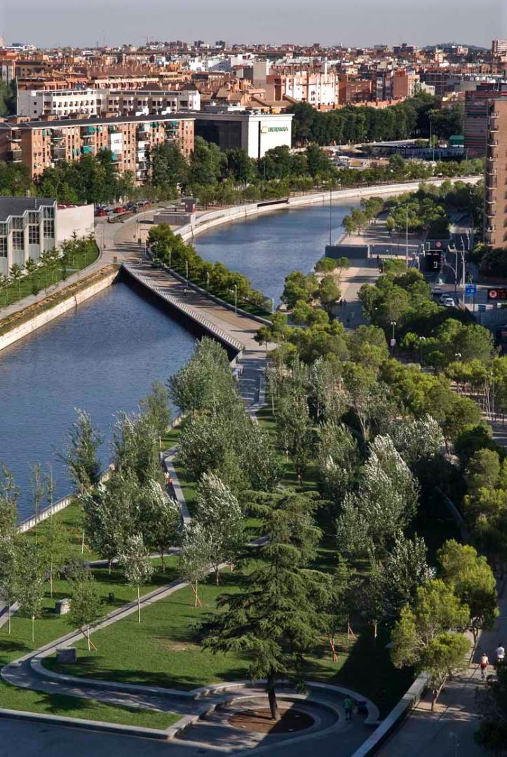 The project is founded on the linear dimensions of the river, which has three aspects that lend themselves to its role as a social catalyst. The first is its continuity, which links and connects the neighborhoods in the north-west, perceived as bourgeois, to those of southwest where the most disadvantaged sectors of the population live and which are characterized by large numbers of immigrants and lower income per person. The second is the vast contact capacity of its two facades, which stretch over more than 3.5 miles and permit intense participation by the residents of six neighborhoods. Its third quality in this respect is its transversal connection with the new bridges that have brought the different neighborhoods into much closer contact with each other. All the local residents use the new public space simultaneously, each in their own way. The park has rectified a distinct shortage of freely accessible green zones and open spaces in the south-east and south-west of the greater Madrid area, but also within the city itself where the neighborhoods are very dense and compact and where opening up pockets of space is a difficult, controversial, costly and very drawn-out process.