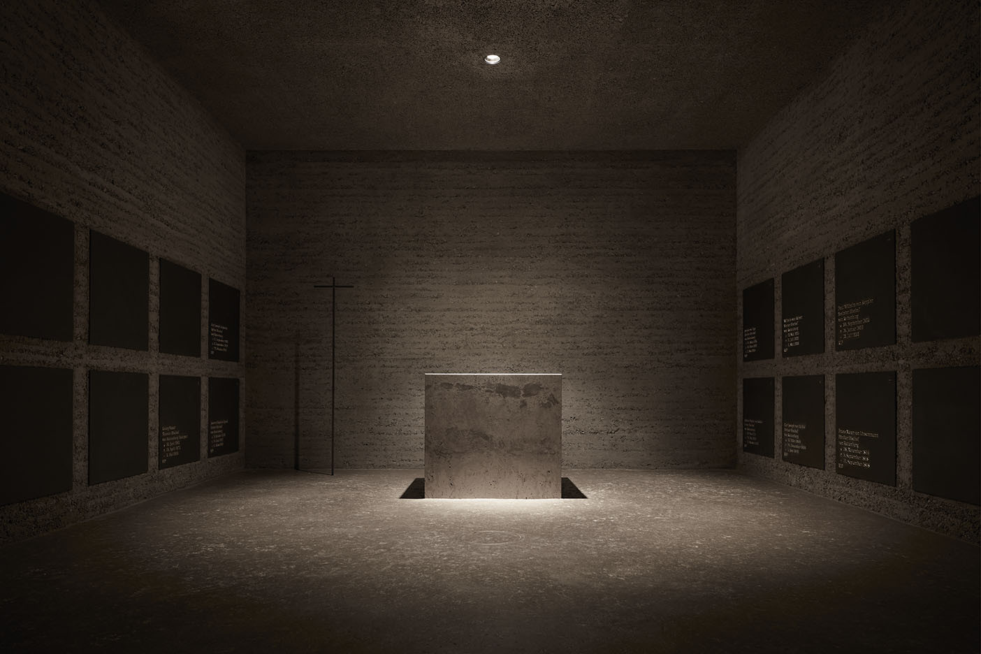 The topic of the end of a life is difficult to frame. There is no exit, no belongings. There is only trust in what is and the believe in what may come. Hoping to be at peace with what was when life ends. The project answers with a perfect balance in radical symmetry. A central stair in the nave leads down towards two sets of stairs that diverge and come together once more. Their slope becomes flatter the further down one proceeds, slowing the pace and making the descent more comfortable. They lead towards a final room - the oratory. A reduced space with a central source of light focusing a monolithic travertine block – the altar, a symbol for Jesus Christ. It reflects the light onto the tombstone of black slate inlaid into the surrounding walls containing the bishop’s tombs. The golden engravings of their names, births, terms of office and deaths shimmer in the half-light.
