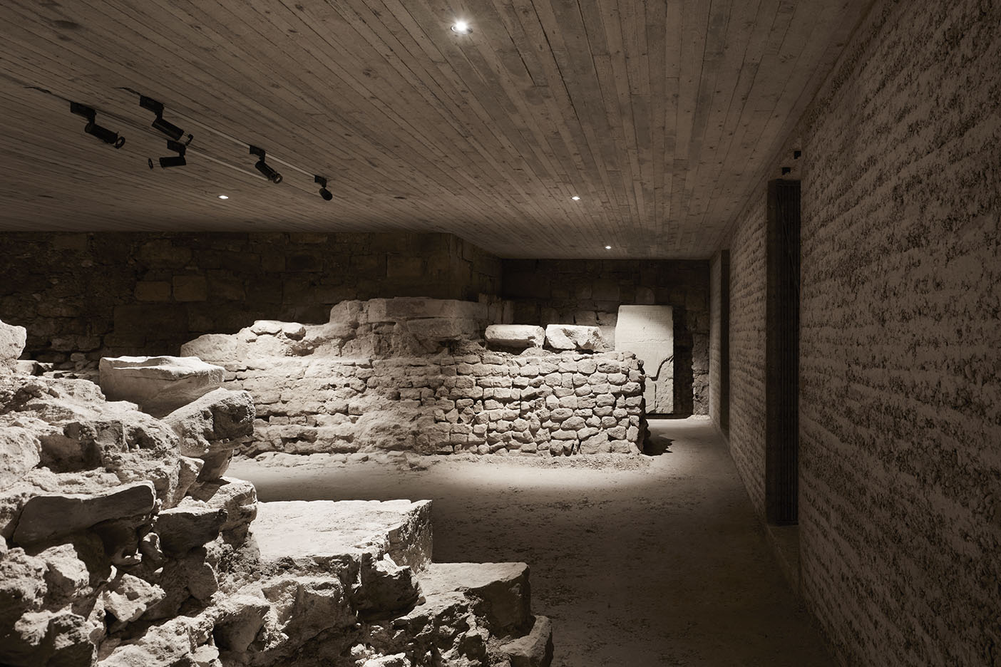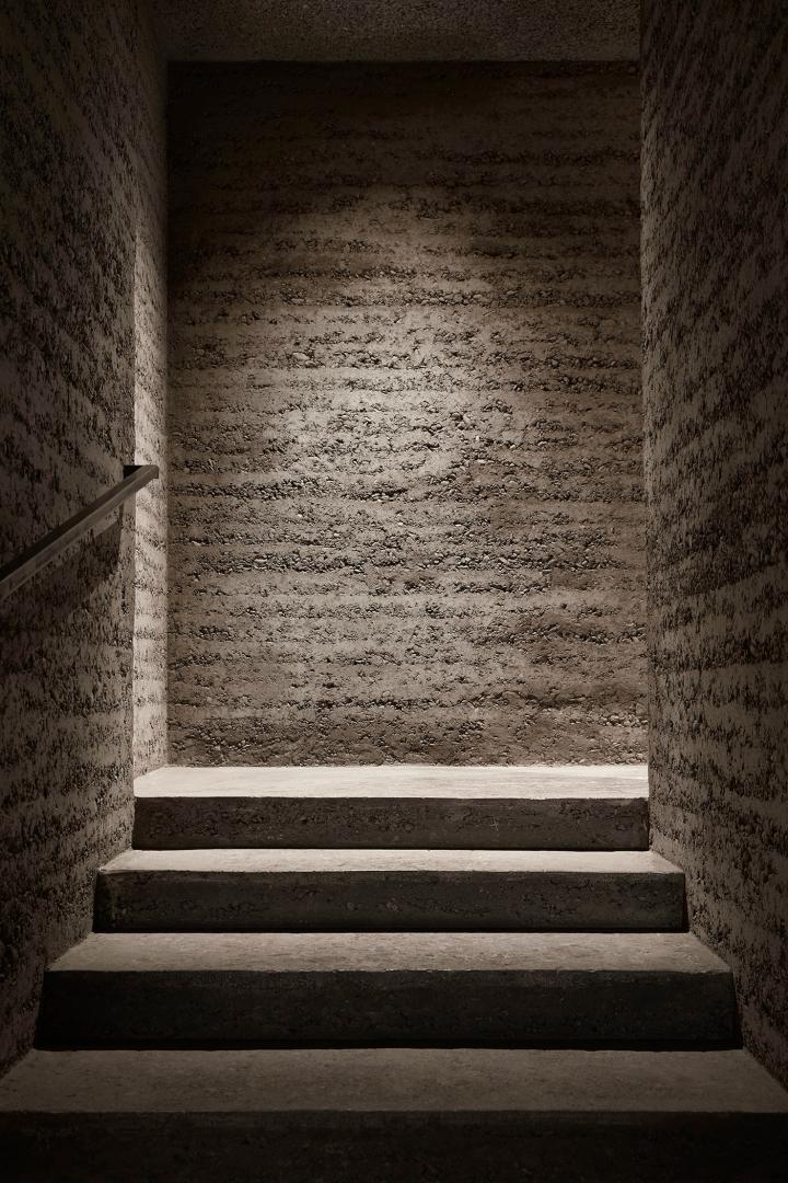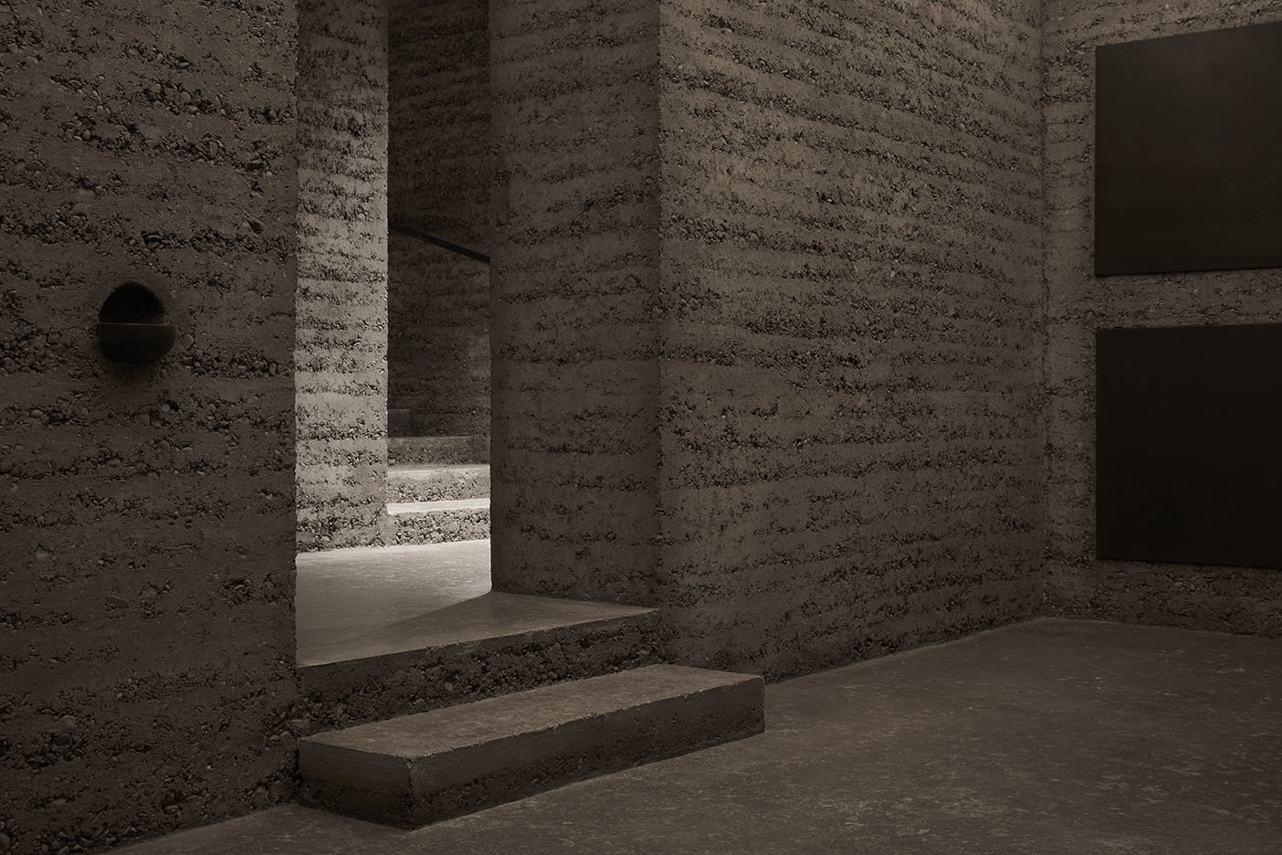 The radical monolithic construction for floors, walls and ceiling in rammed earth is reminiscent of early cave tombs or the monolithic cave churches of Lalibela in Ethiopia. It feels as if the spaces and passages were carved out of the earth and creates an almost mythological underground space. The layering of the construction method reminds of archaeological or tectonical formations that carry the history of the place and creates a feeling of timelessness.