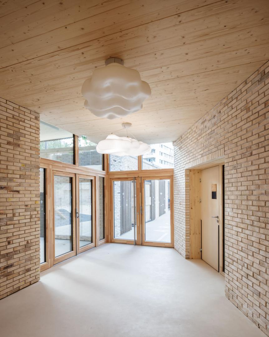 The architectural element and its materiality have been developed based on a dialogue with the depth of the route and the inner street. How do you traverse a long building facing one way for almost 40 yards? How should this space-time be occupied? What is the intention? Using what light, and what relationship to the outside? This is where the concept of an inner street came from, which expands to suggest a direction, a leisure centre, and takes children and parents to the heart of the school. This street is formed by regularly occurring interior structures with functional and structural thick volumes. These thick brick walls mark the boundaries of the children's spaces. And lastly, the partitions between the traffic spaces and the children's rooms are made of wooden frames which are often load-bearing and are fully glazed. The street is lit on both sides by direct views towards the facade or through these glass rooms, which themselves have a relation to the courtyard.