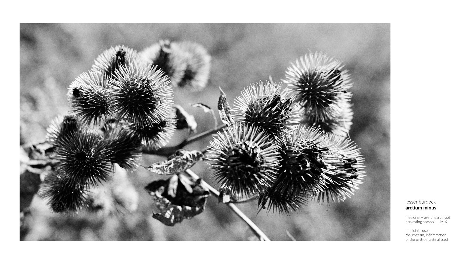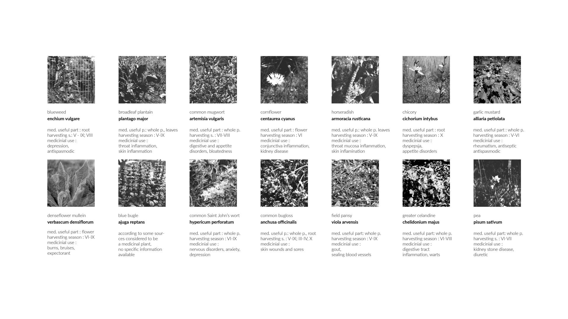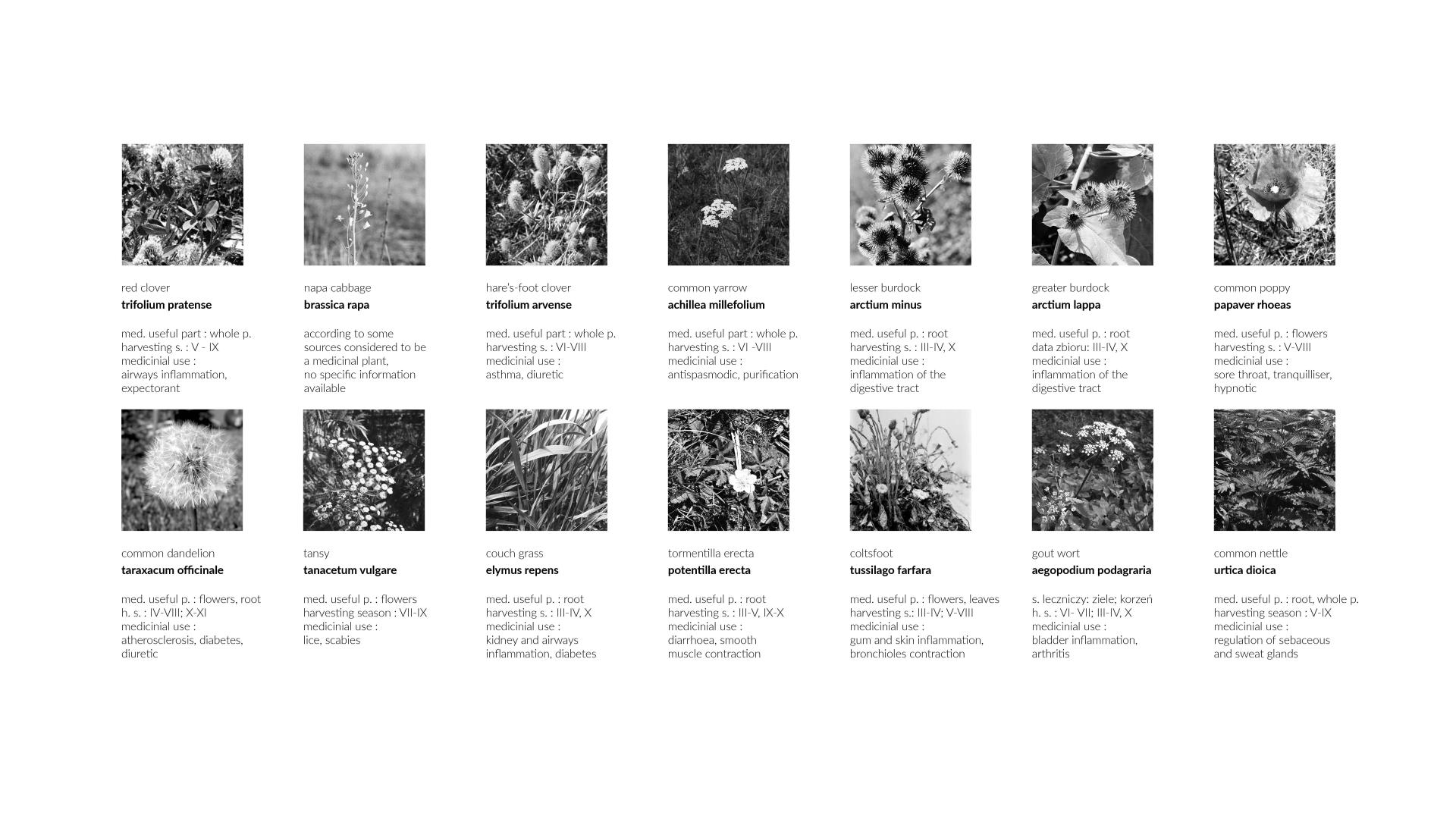 As the project issue was undertaken, the remaining flora of the undeveloped plots of land was carefully studied. On this basis, a catalog of weeds was created. To amplify the human-nature relationship, a group of plants with healing properties was extracted. The work was completed with a collection of several dozen species, which are only a small part of these areas' diversity.
