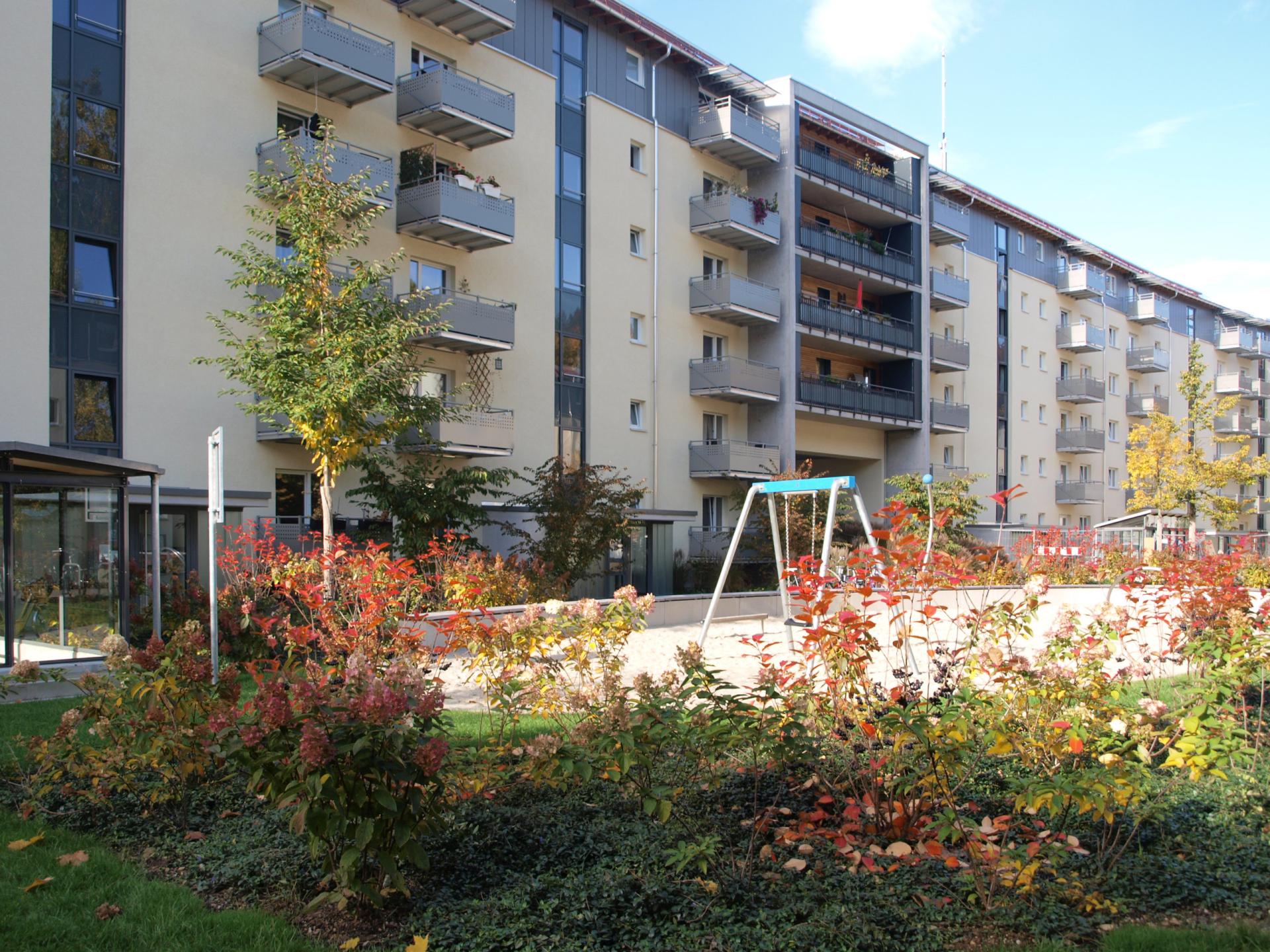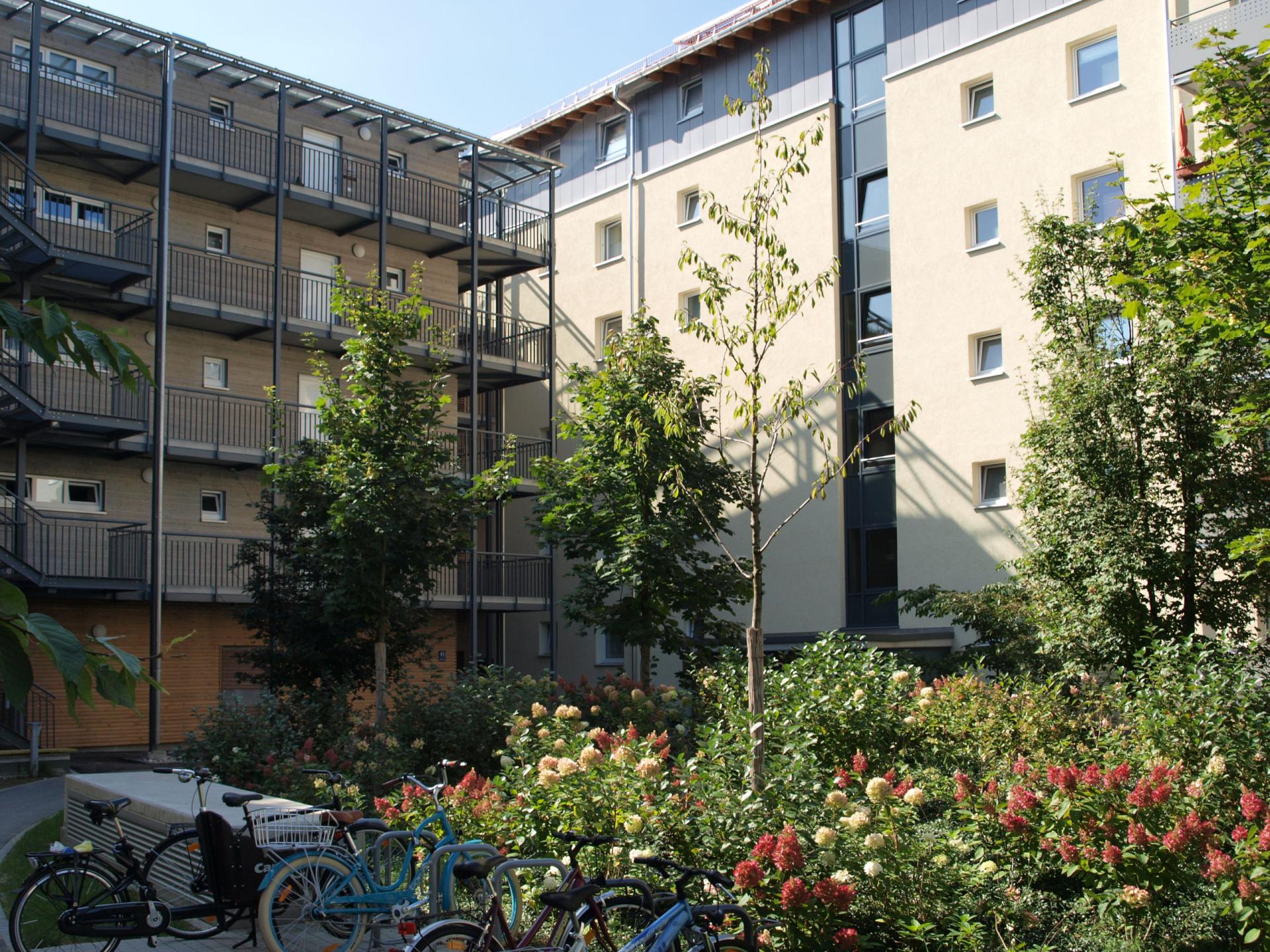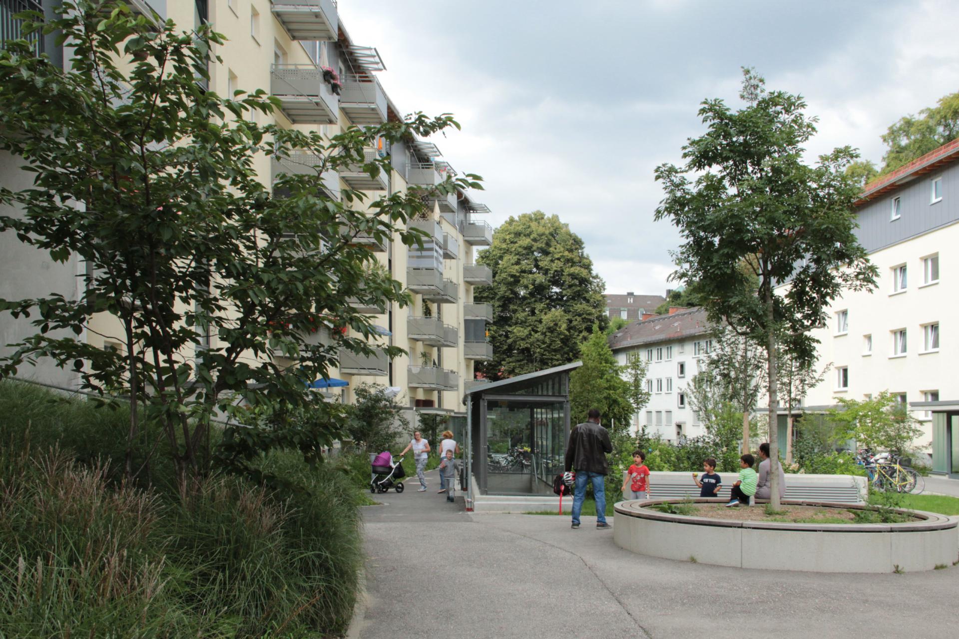 The modernization provides future-oriented housing offers which meet the living requirements of residents. An additional living space of 2,819 m2 was created by increasing the existing buildings by one floor, an additional building with underground parking and a new wooden building. The carefully planned densification with additional buildings preserved the existing qualities of the quarter. However, despite newly created space, due to the increased apartment sizes, the total number of apartments was reduced to 140. After completion of the project the quarter provides a total living space of 9,332 m2.
