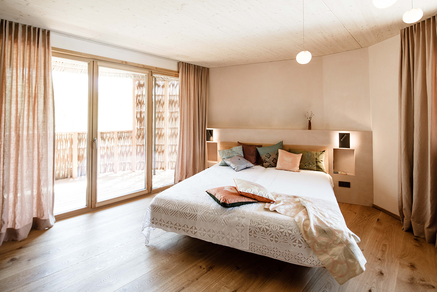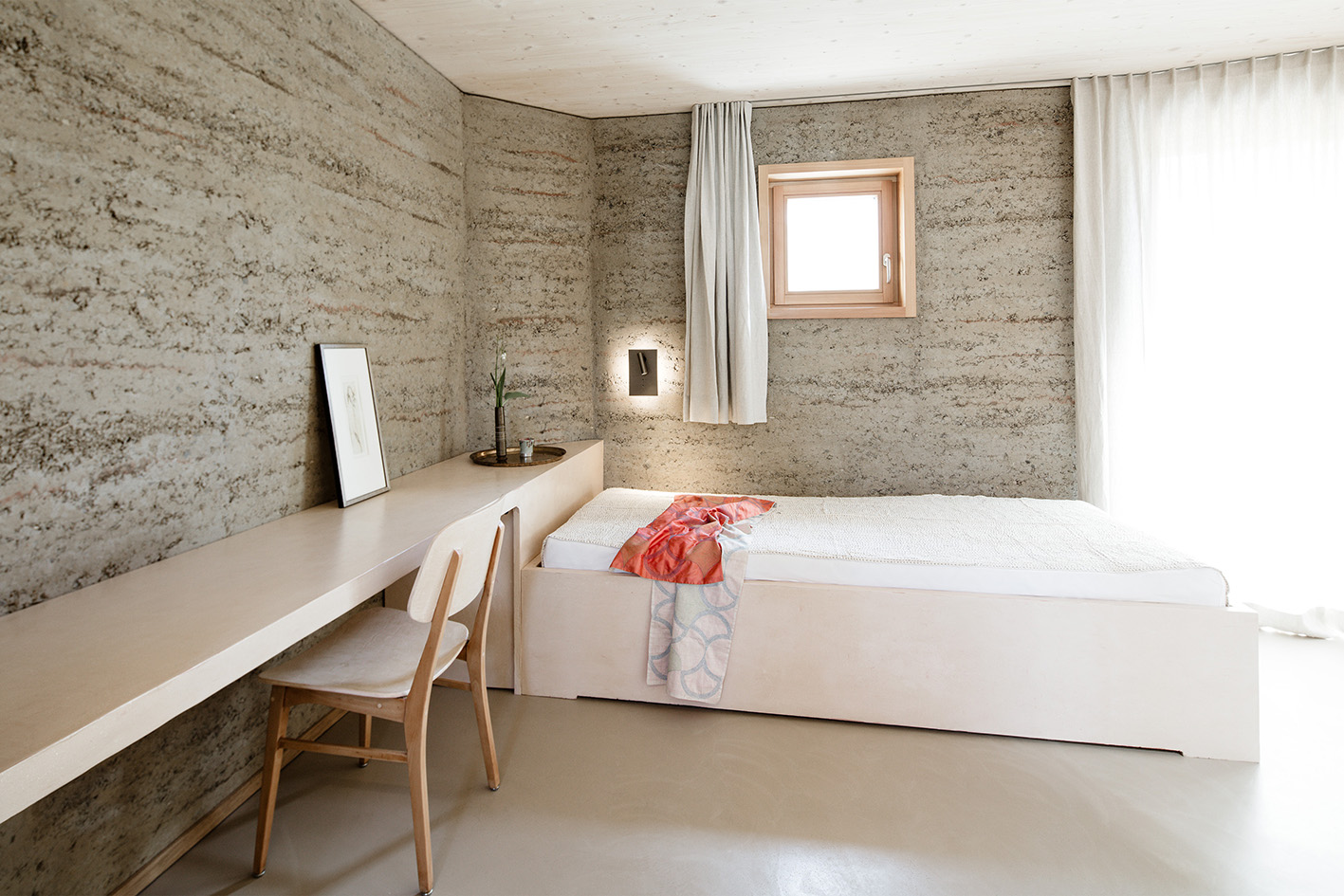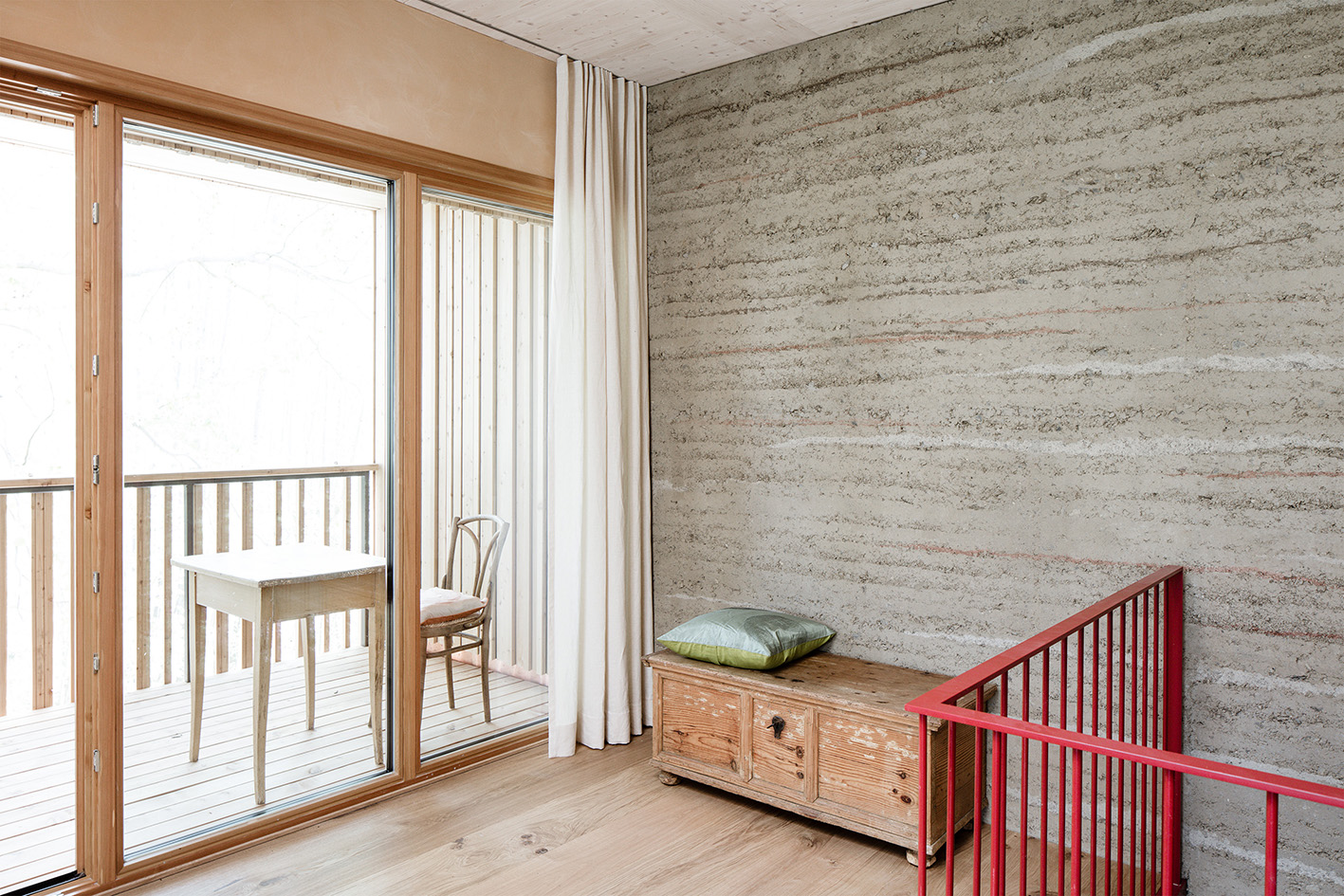 All partition walls of the individual guest rooms are designed with a hybrid construction made of wood and rammed earth for acoustic and design reasons. The 7 cm thick rammed earth walls were prefabricated and acoustically decoupled in front of the wooden wall in individual elements. The cavity between the wood and rammed earth was filled with a 3 cm thick wood fiber board. Due to the water solubility of the clay, the joints can be retouched with the original material so that the clay walls regained their monolithic structure. The clay casein floors, together with the fine clay plaster, bring warm color accents into the rooms.