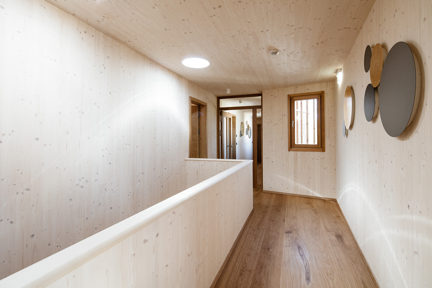 All interior surfaces of the rooms are clad with different clay construction techniques because of building physics and room-climatic reasons. Most of the clay wall surfaces are applied directly to the wooden structure with 2-3 cm thick clay renderings with integrated wall heating using reed mats as a carrier.