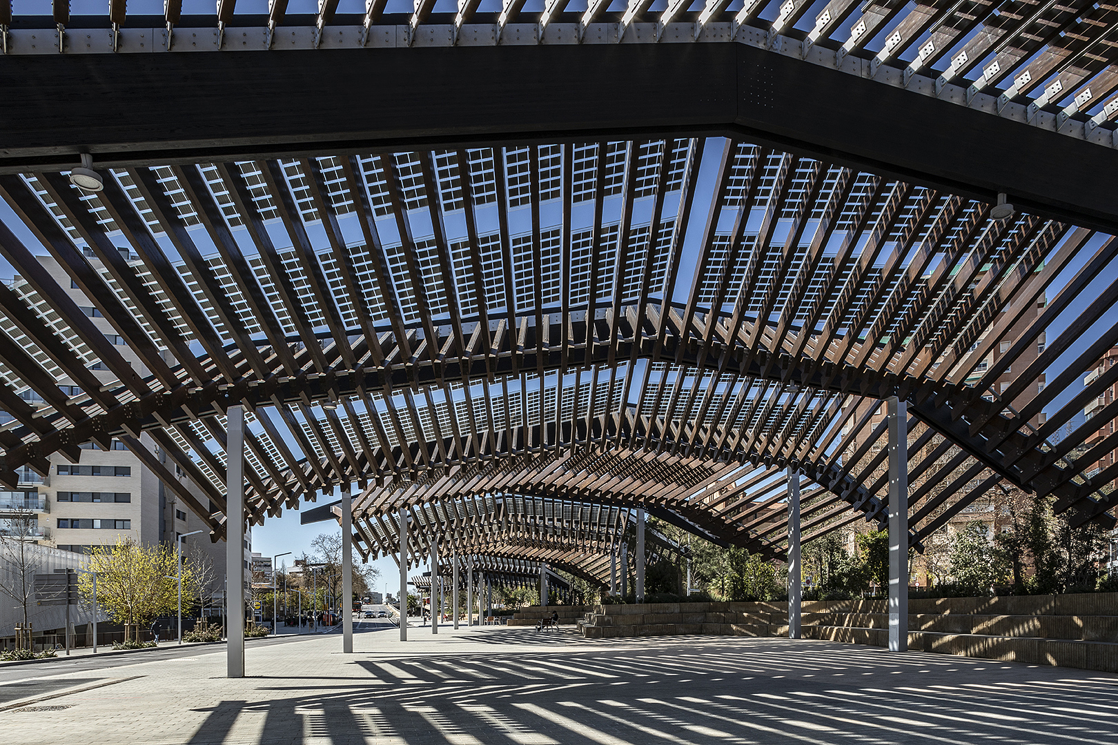 The new coverage of the Ronda and its urbanization is a clear example of urban recycling,where the demands and demands of the city change,and with it its spaces. Three large wooden pergolas with photovoltaic panels, which little by little will be colonized by vegetation, shade the square and the boulevard, making this new social axis a quality public space. A new public space is designed in line with the climate emergency despite the technical conditions of the road infrastructure.