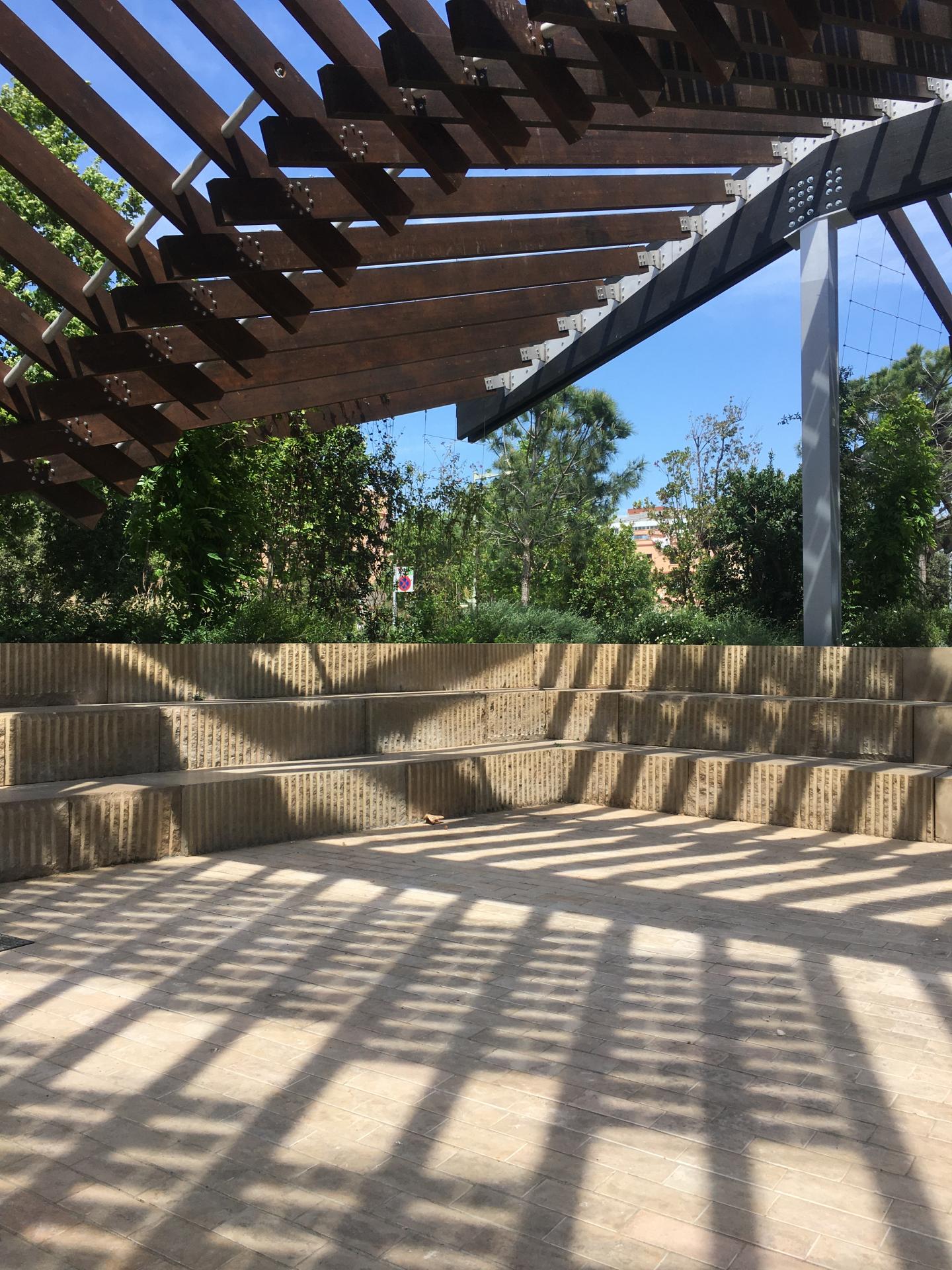 For the materialization of the pergolas,we have opted for wood,a natural,sustainable and renewable material that has excellent technical qualities for use in practically any type of construction.But their use not only improves the quality of our cities,but also increases the forests used for their production, improving their maintenance and favoring rural employment.The selected wood is European larch pine,one of the strongest and highest quality woods available for the construction of structures in Europe.It is a wood found in the north of the Iberian Peninsula,in France and in the center of the continent,avoiding the importation of tropical woods.The vertical cut ends of the beams and the placement of an upper finishing piece,protect the points most susceptible to water ingress,preserving the material from deterioration.In addition, the stainless-steel joints ensure the maximum durability of the structure.