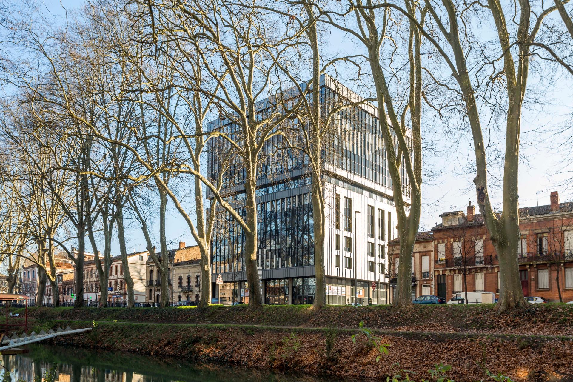 Letellier Architects chose a bold transformation of the former MSA and Chamber of Agriculture of Haute-Garonne building, an iconic 1970s office building located along the Brienne Canal, into 153 student housing units - a project completed in September 2019.