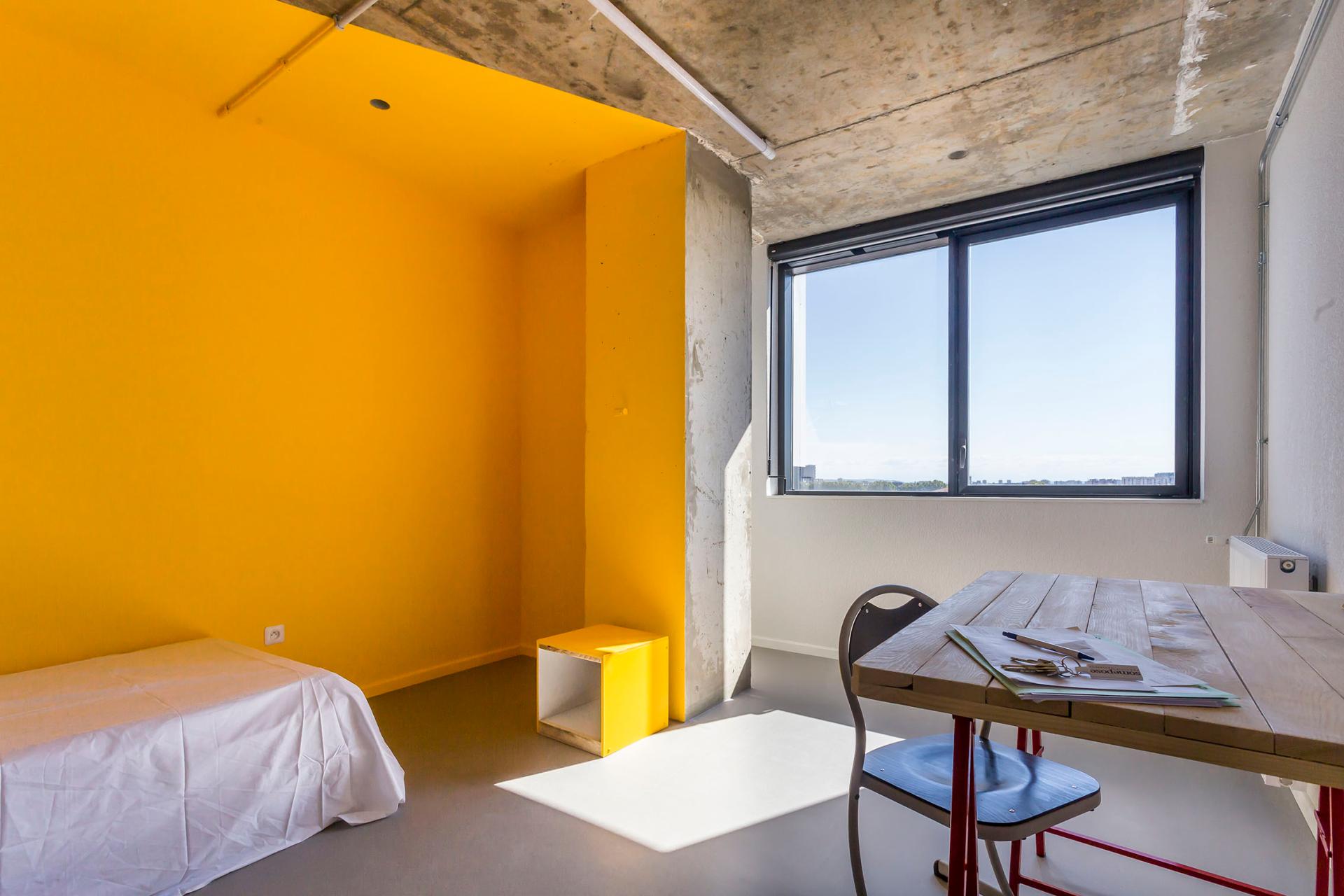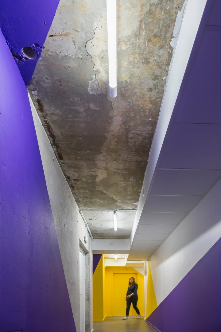 The inner transformation is radical. The structure and the concrete ceilings are preserved and left visible. They are the markers of the first life of the building. In each studio, a spot of colour extends by visual effect on a wall and a part of the ceiling to affirm the strong architectural party of the project while facilitating the appropriation of the studio by the student.