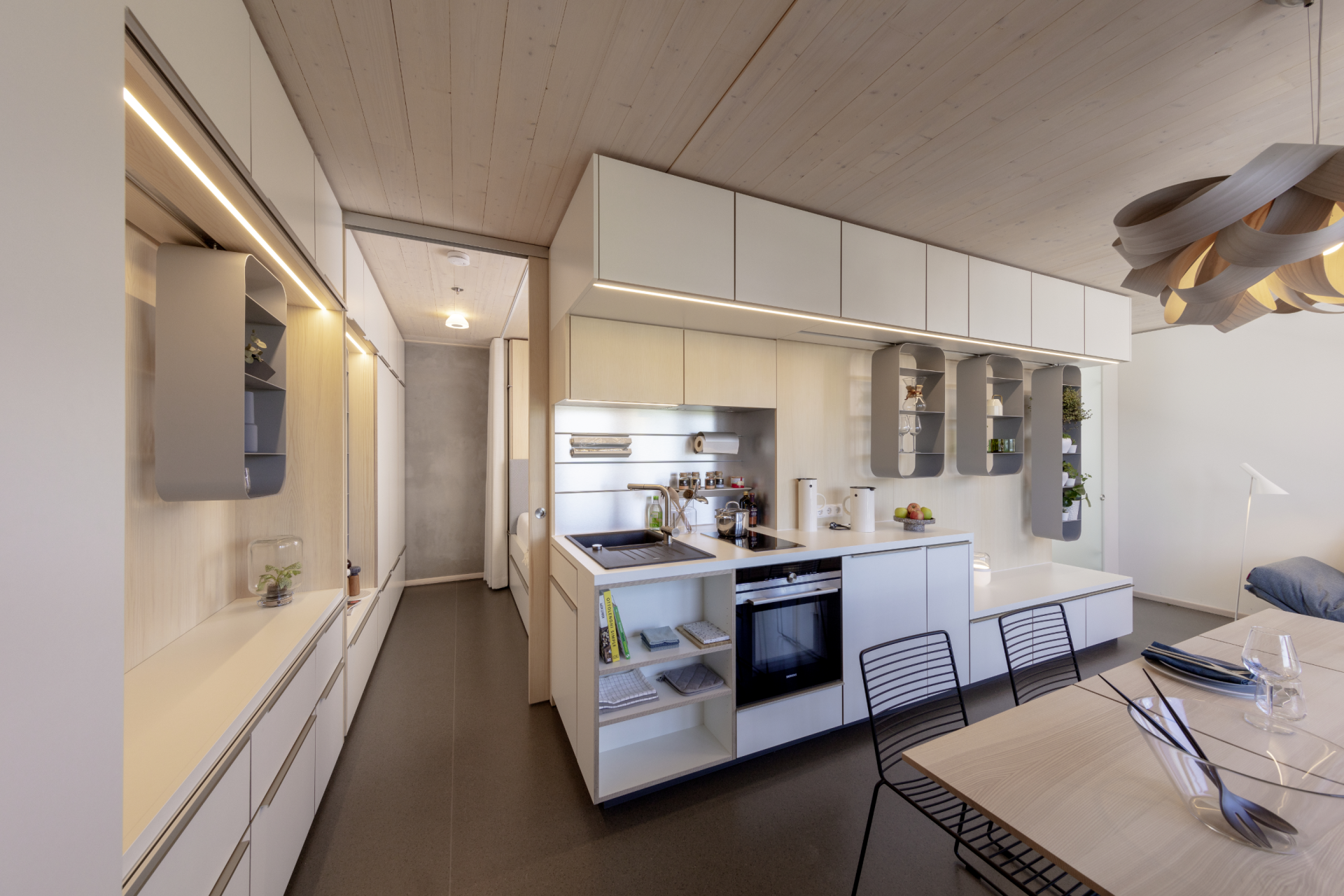 It is not only the height that is remarkable about Germany’s first high-rise built of wood. The building has an organic architecture and makes a statement about people’s need to reconnect to nature, as well as their need for better indoor air and light quality and better social interaction. Loggias and ceiling-high windows without the usual anti-flashover parapets give the bright apartments a high quality despite their compact floor plans. On all 10 levels, the wood material has been left visible on large portions of the wooden walls and ceilings; the sprinkler system and the combination of wood, concrete and steel make this possible.