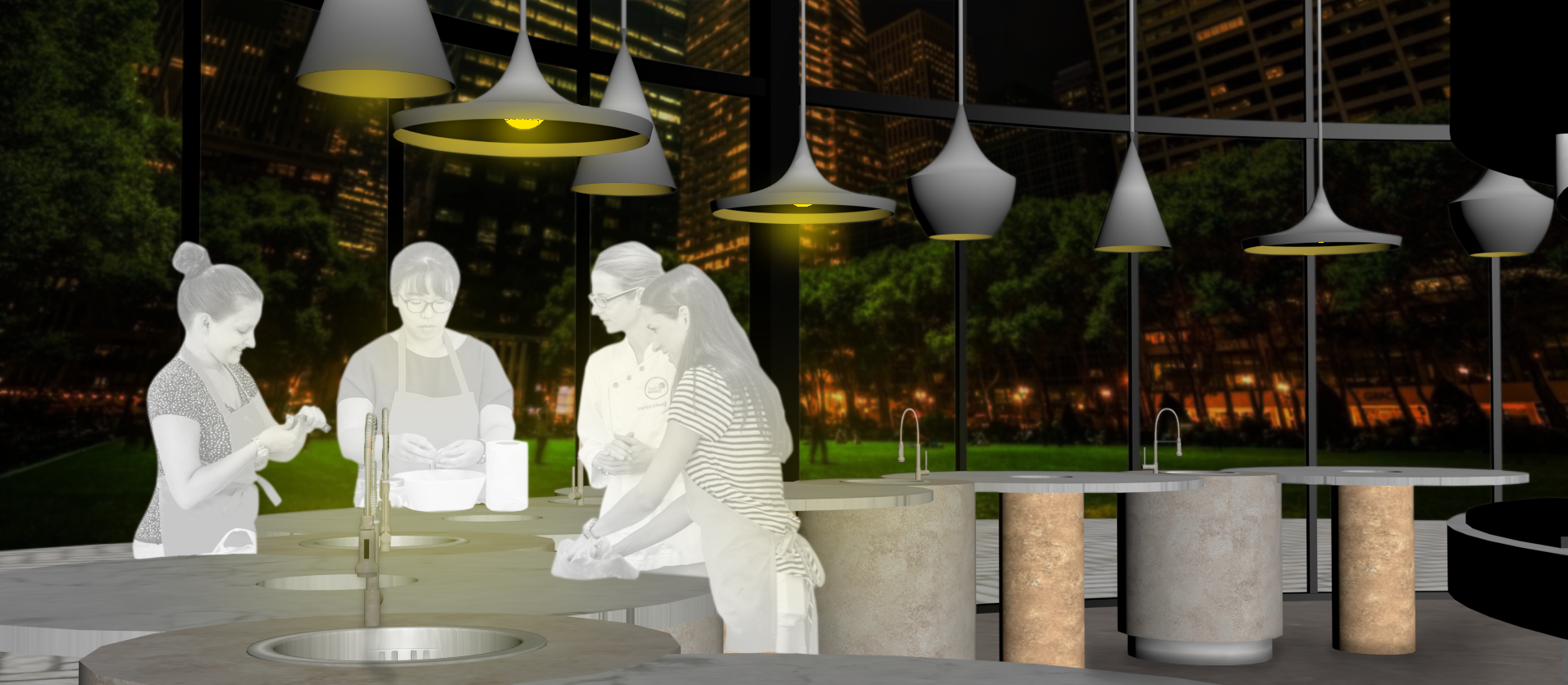 For the 'MeetEat' Home, the pilot project aiming to create inclusion through cooking and sharing food, the architecture is characterised by circular shapes representing the concept of 'containing', like a pot or a cauldron where ingredients are transformed into meals and rituals. The structure is composed of two cylindrical and concentric volumes: the central volume is the Kitchen, which is the core of the experience in this Home. This is the space where the transmission of knowledge, rites and myths takes place. For the design of this area, an innovative organisation of kitchen tools was chosen, following the desire to abstract as much as possible from specific culinary traditions in order to maintain a neutral and open approach. The main distinctive feature concerns the central cooking blocks: oven, grill, fryer, etc., are here identified with the ancient bonfires around which the community gathered to hear the people' myths.