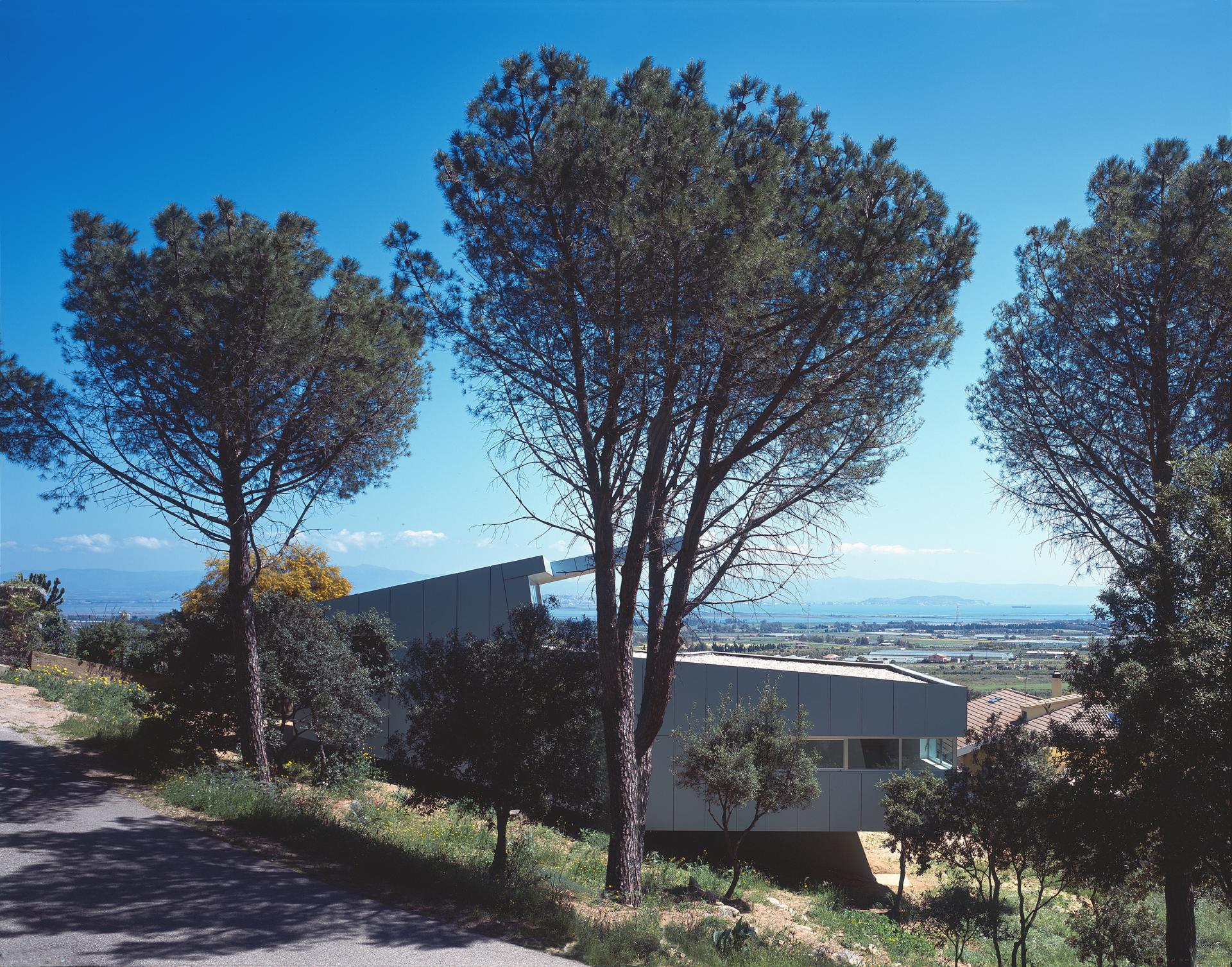 Located on sloping ground on the pines and oaks forest border, the building appears as an extrusion of one of the outcropping granite boulders that occupy the area. This organism changes along the longitudinal section, shapes itself adapting to the slope, bends following the presence of the trees and arches away from the ground to allow the runoff of surface water. While entirely closing towards the windy northwest, it opens to selected views: over the forest in the foreground, over the agricultural plain and the Mediterranean Sea in the background. Articulated by a living program for a young couple reduced to its minimal spatial components, it engages with the landscape and expands the interior space towards a patio that acts -due to a mild climate- as a privileged everyday place.