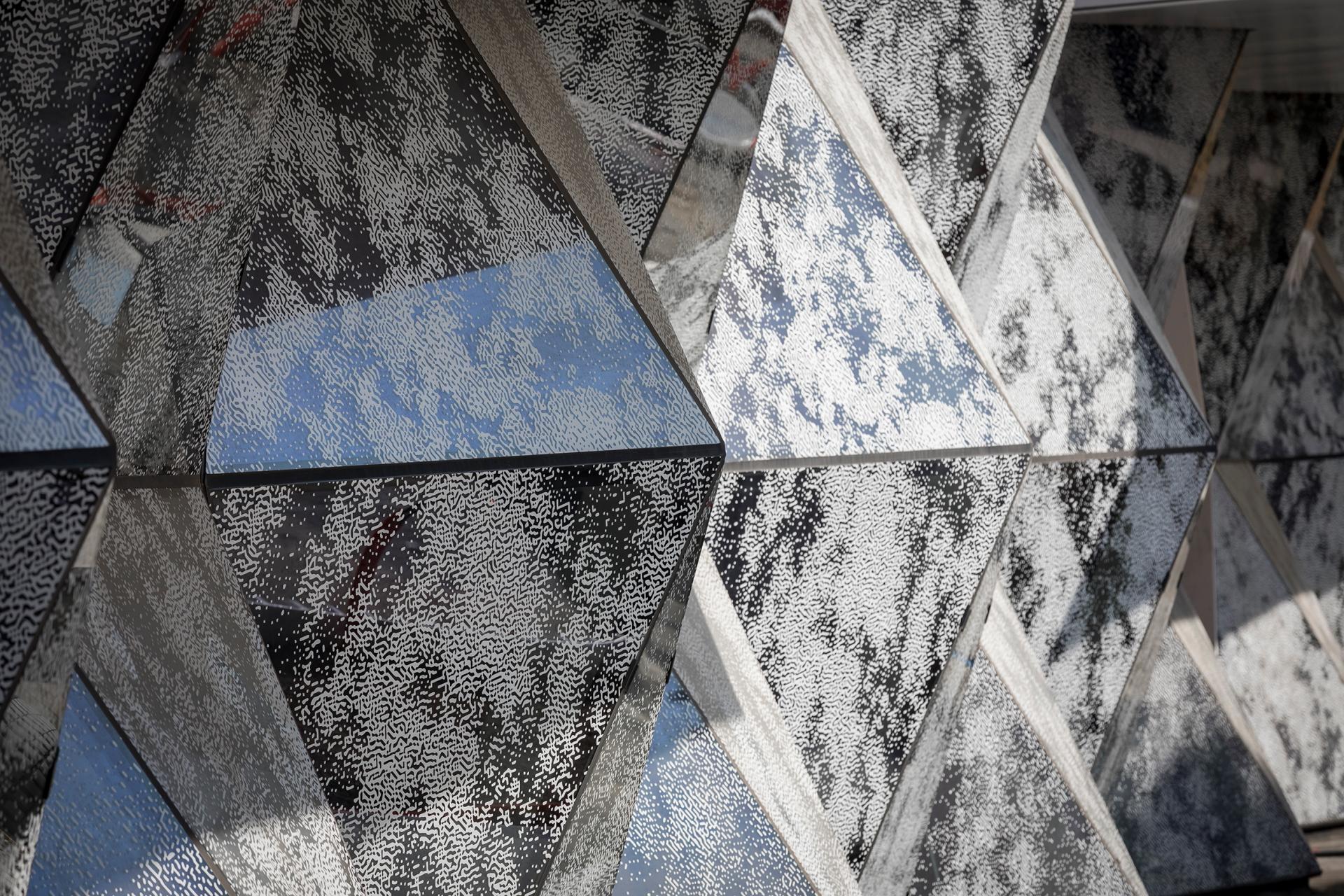Another special feature is the screen-printed glass, which provides a dual function of protection against the sun by reducing heating and glare. The variable intensity of the silkscreen printing gives the building, seen from the outside and from the distance, a marbled effect. From the inside, the facade is more transparent with a play of open and opaque triangular surfaces.
