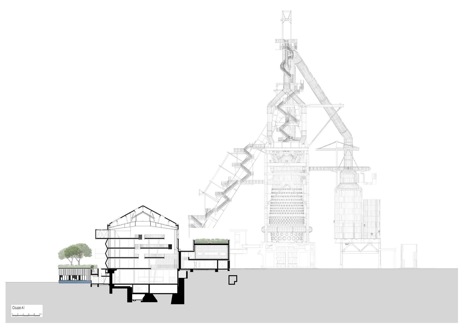 Large open spaces, accessible to the public are presented on five levels, giving the impression of flying plateaus around the ore silo at the foot of blast furnace, which was kept a reminder of Belval‘s industrial past, but also of the country‘s know-how and innovation capacities.