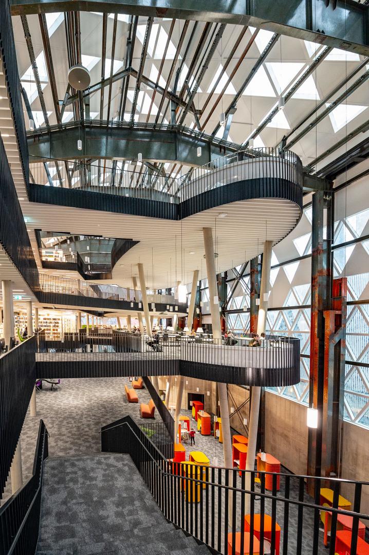 Digitization and smart building are key concepts of the LLC. The entire building has geolocation - a tool that recognizes and understands user behavior and allows deployment of staff to be optimally controlled and resources to be conserved. The functionality of the library is fully digital - access control and lending system allows fully electronic research on site and guarantees an external access.
