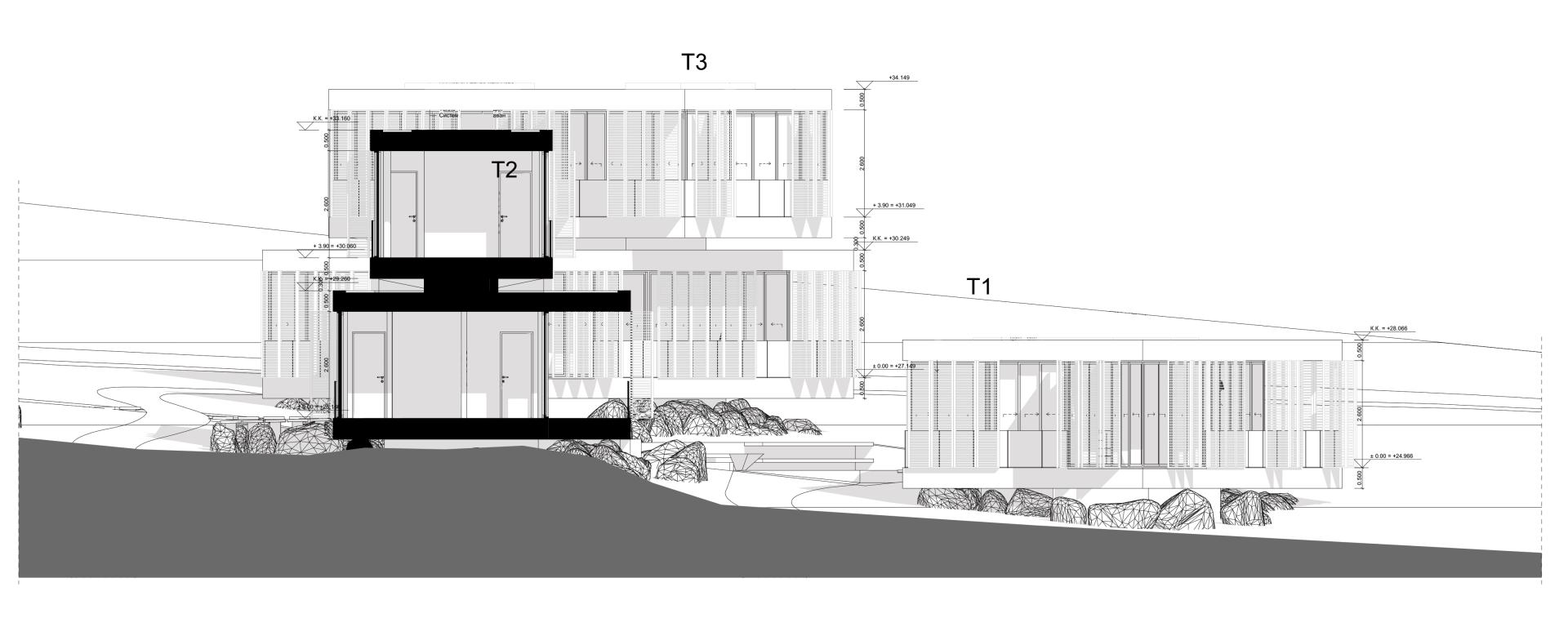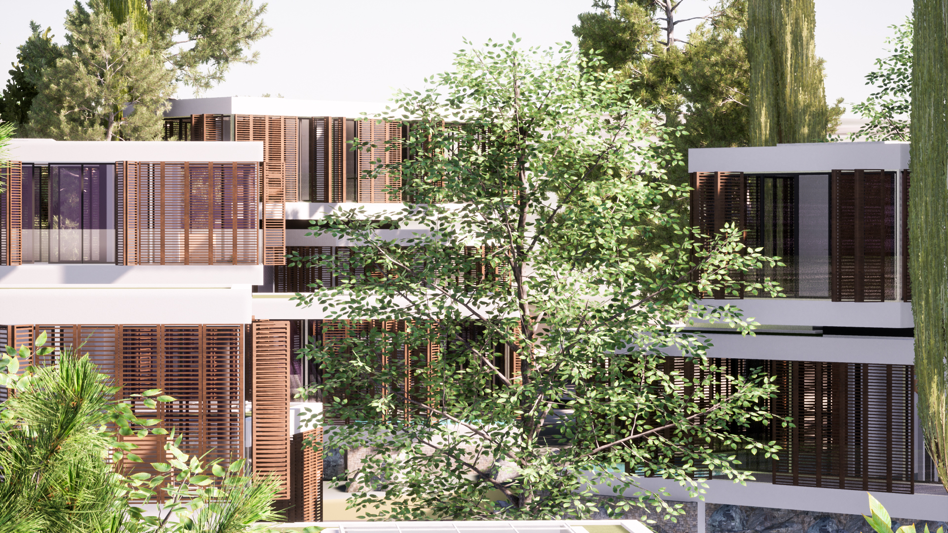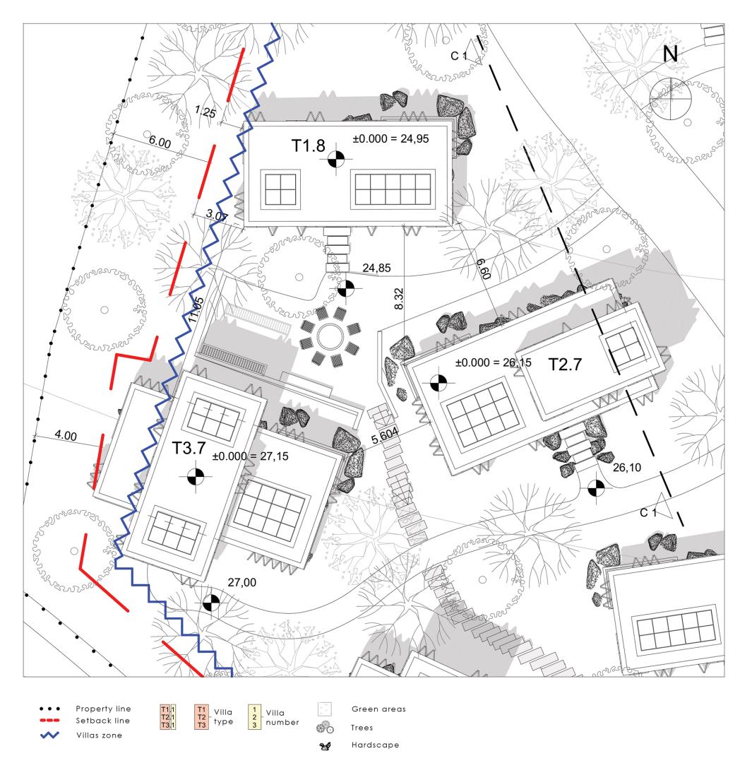 40 villas are grouped in clusters of threes. Each villa is built around an existing tree which becomes a strong part of the interior space. Villas are rotated in different angles from each other so that each one has direct view to the sea.