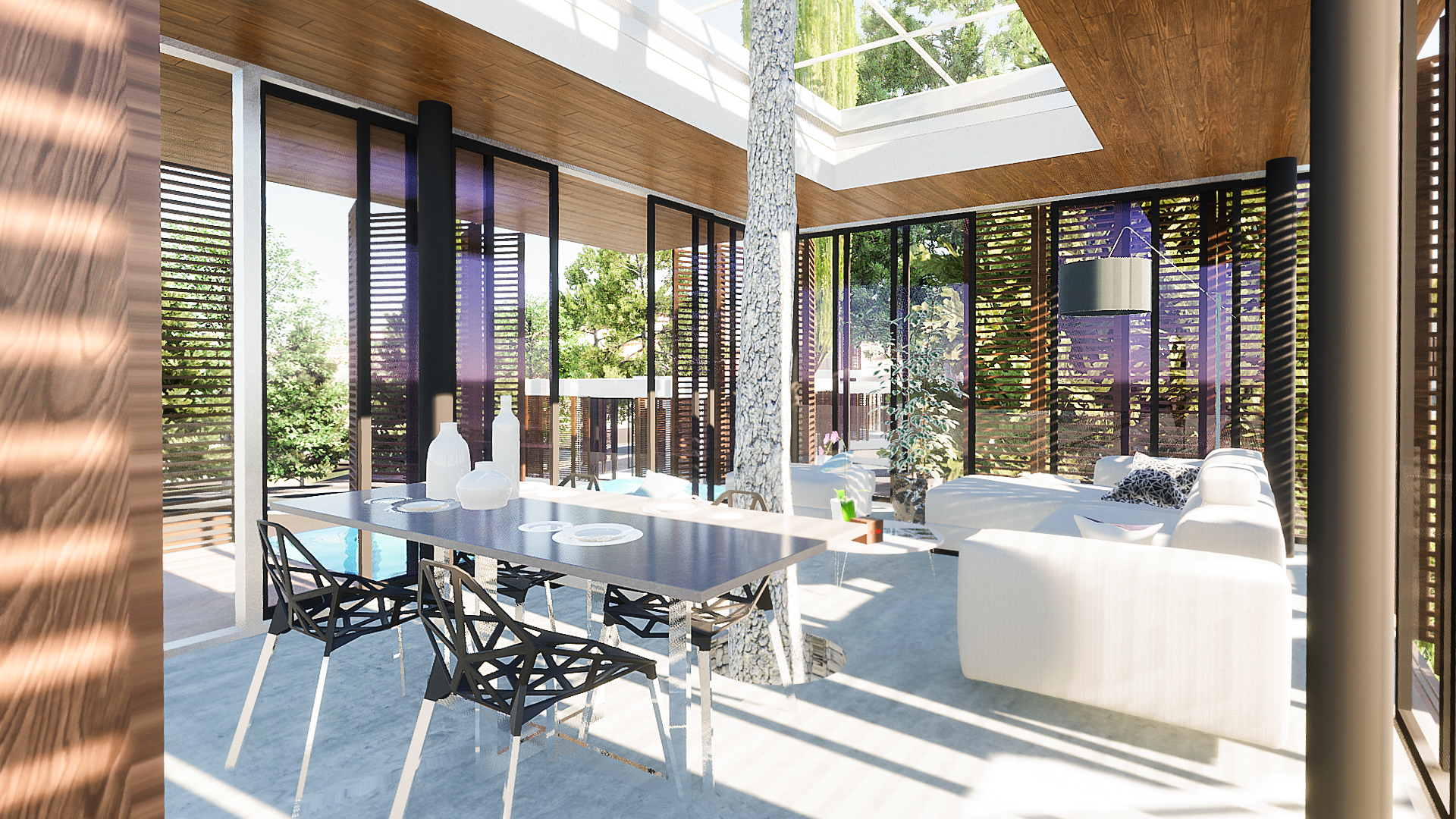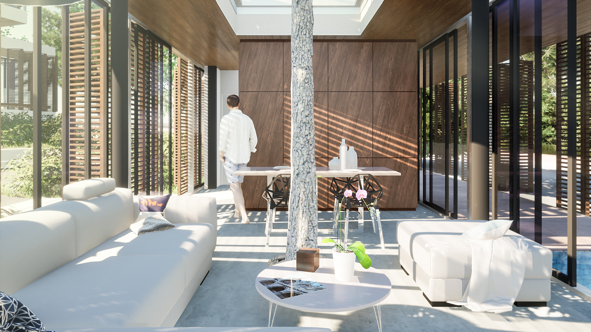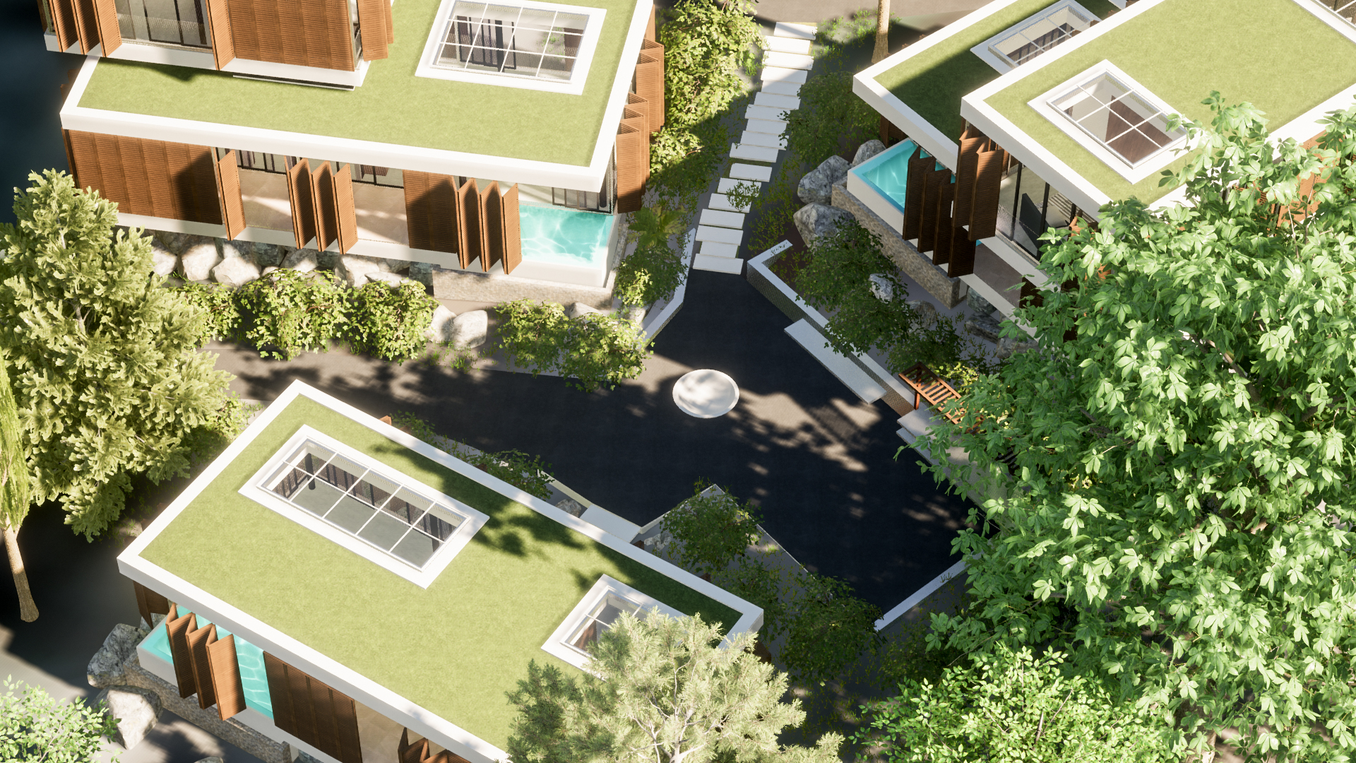 Biodiversity: Each villa is built around an existing tree which becomes a strong part of the interior space. Each saved tree benefits the flora as well as the fauna. For example, birds can nest there and people are closer to them which is a natural promotion of biodiversity.