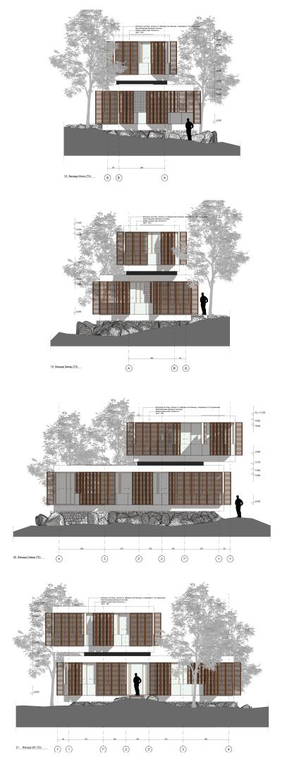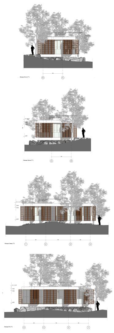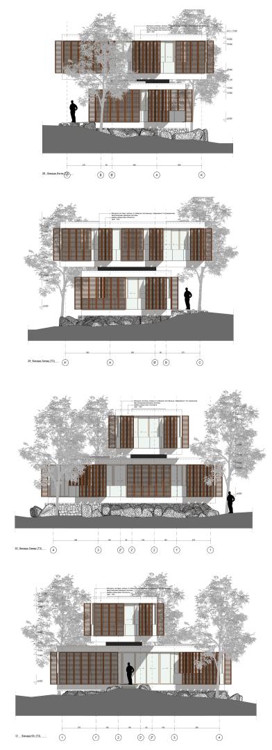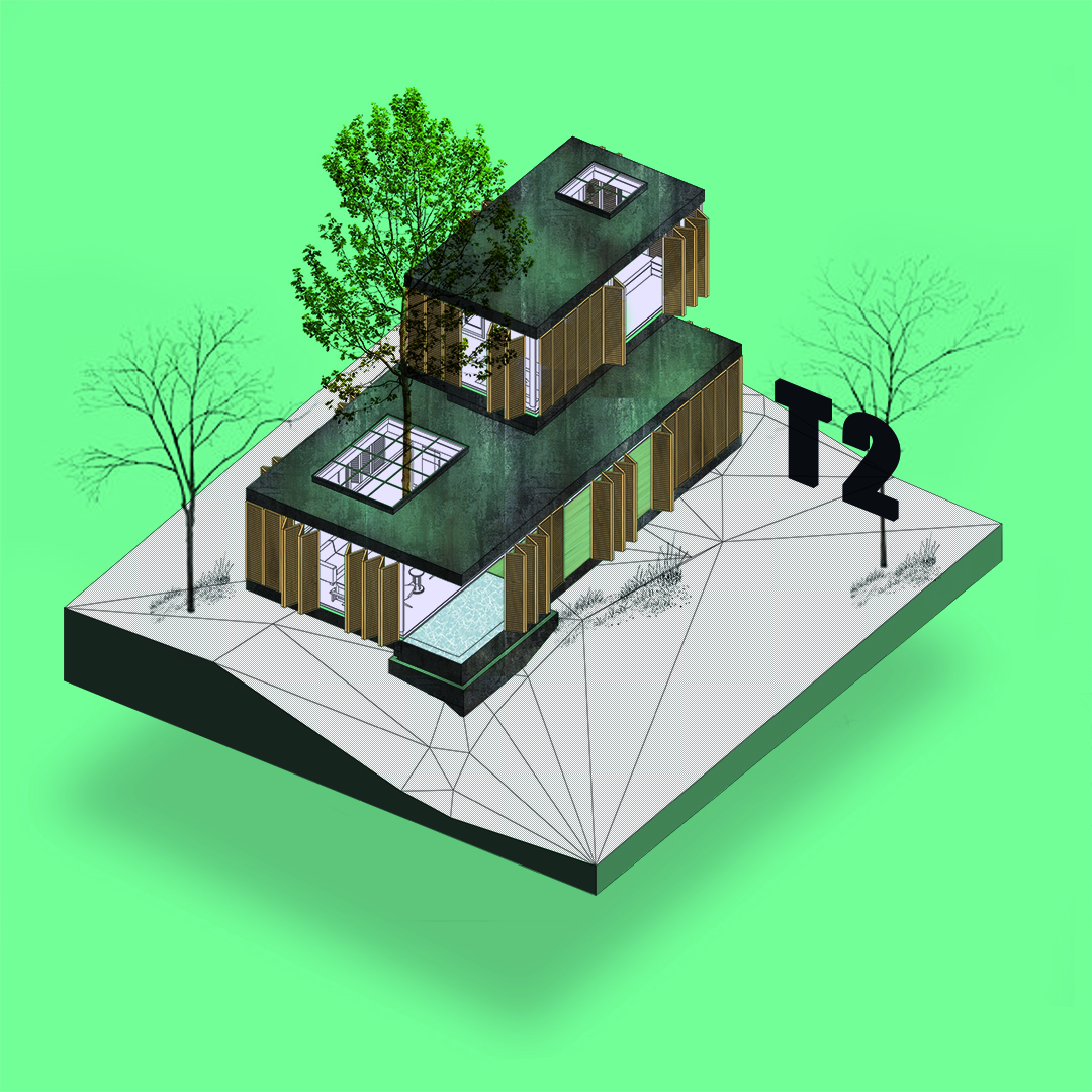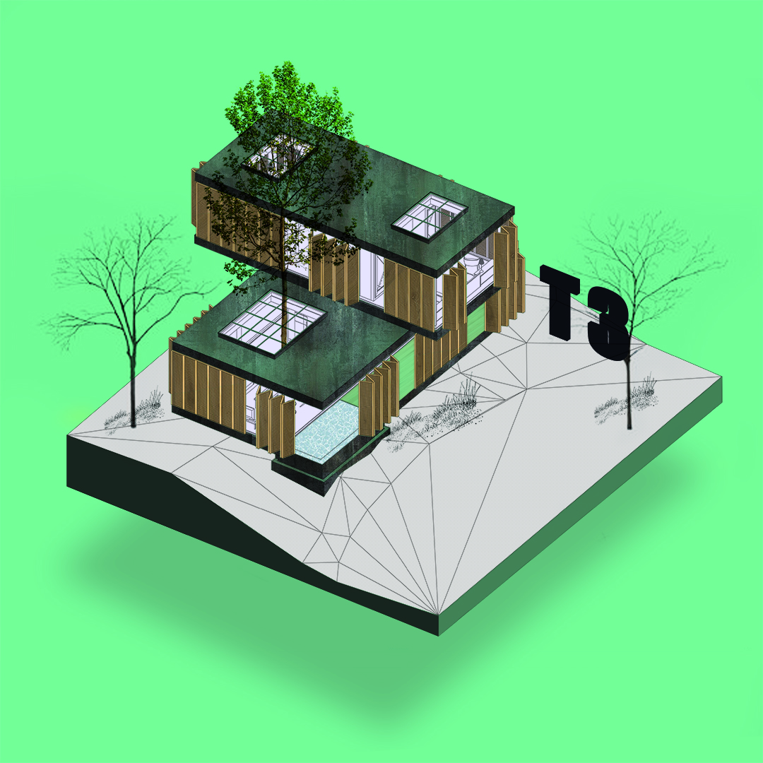 Design strategies: Natural ventilation (Stack effect), Automated smart systems for controlling the quality of the indoor microclimate, Maximised green spaces for controlling the quality of the outdoor microclimate, Module construction; More dry construction processes; Less wet construction processes; Shading devices (interpreting authentic houses' wooden fasade cladding).